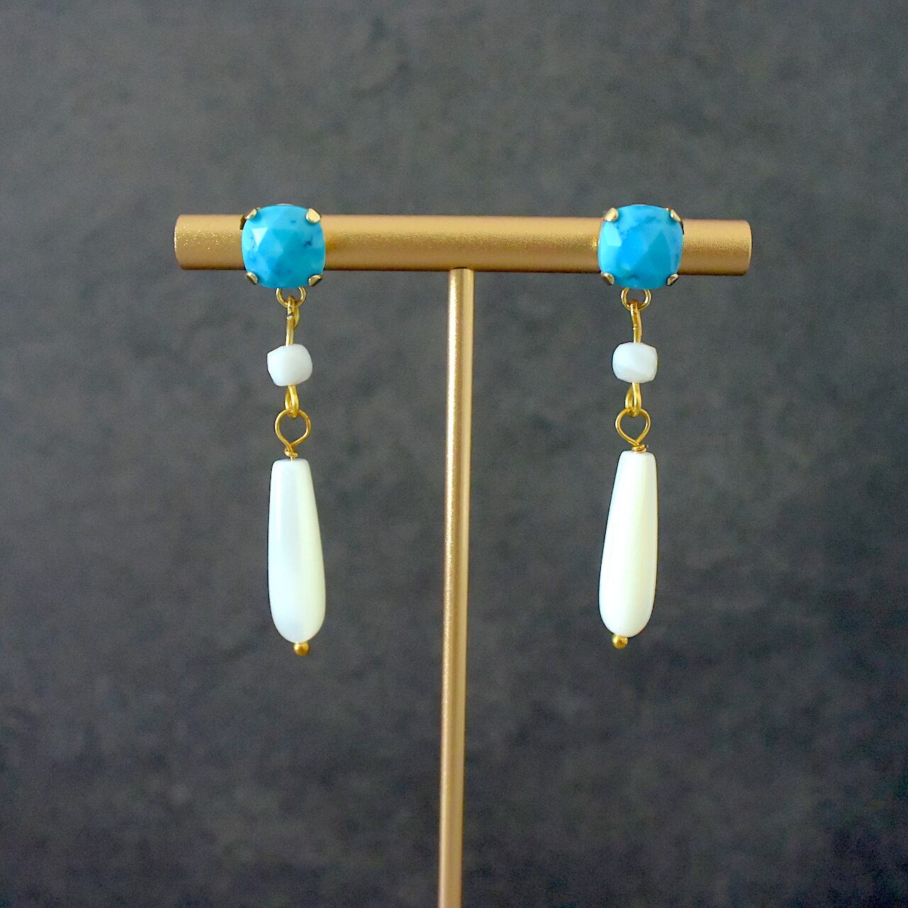 ファセットカットされたスクエア型のターコイズに、ホワイトシェルのドロップ型ビーズを合わせた、夏らしいエキゾチックな雰囲気のピアスです。