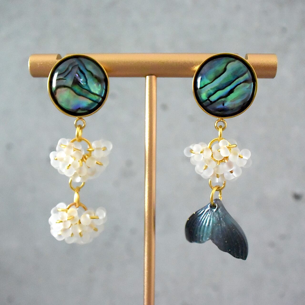 アバロンシェルのピアスに、アクリル素材のフィッシュテールと泡のようなチェコビーズでアシンメトリーに仕上げました。