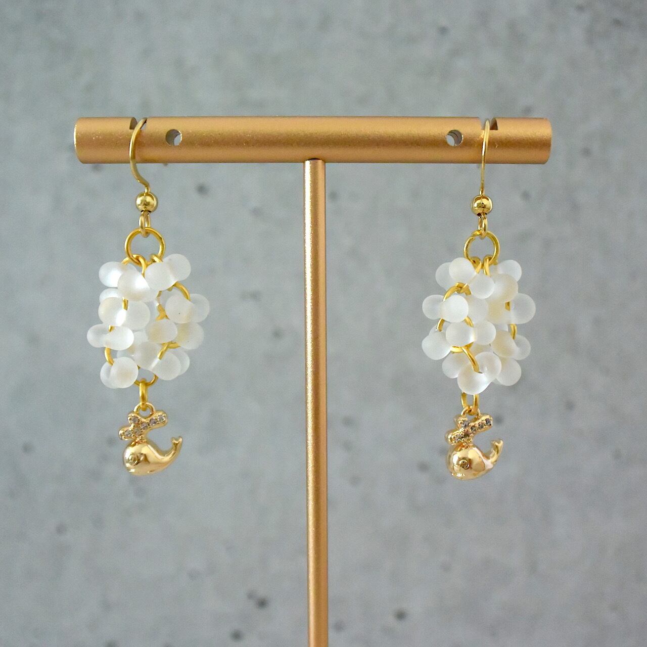 チェコビーズとかわいいクジラのチャームを合わせて、潮吹きしているような水飛沫をイメージしたピアスを作りました。