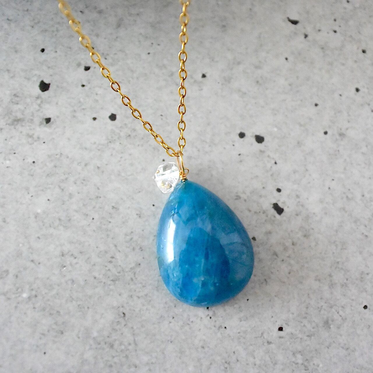 マダガスカル産 特大ブルーアパタイトとハーキマーダイヤモンド K10チャームネックレス