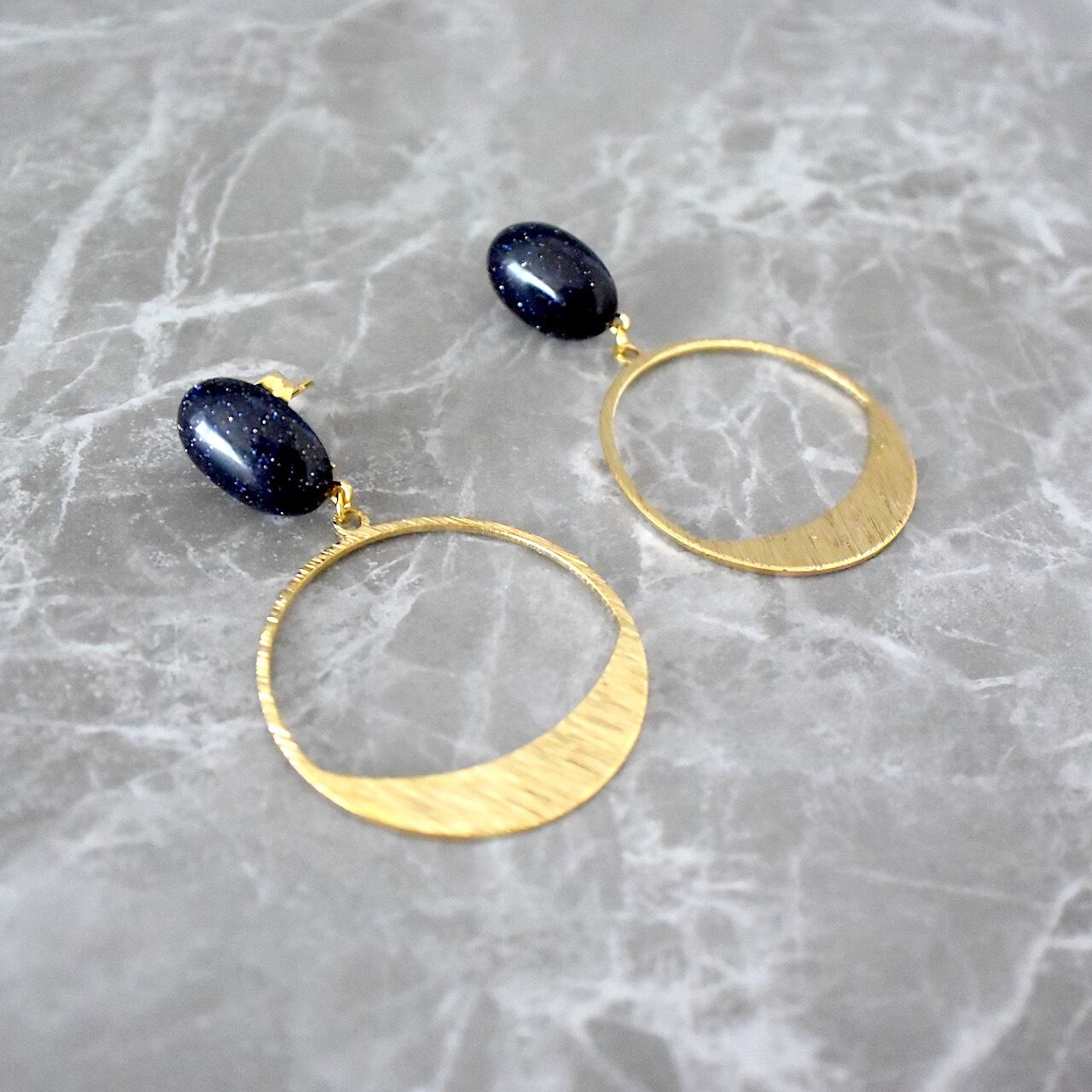 まさに夜空のような色合いのオーバル型のブルーサンドストーンと、真鍮製のチャームを組み合わせた、シックで存在感のあるピアスです。
