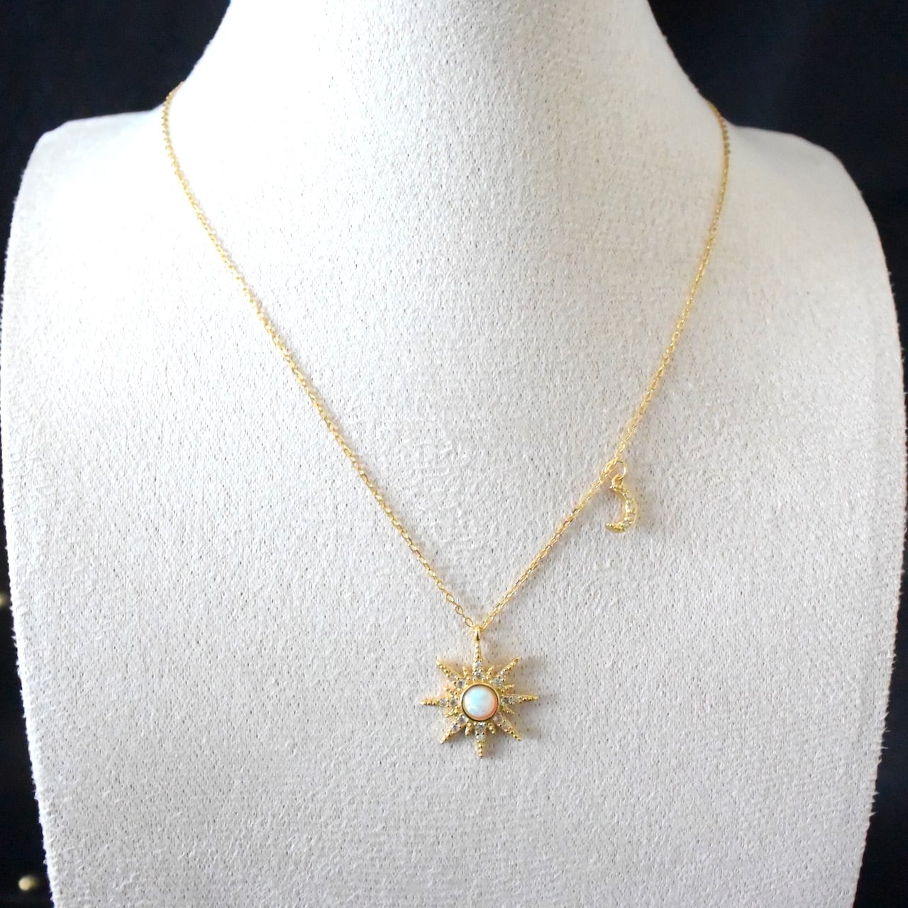 ジルコニアがキラキラと輝き、中央にはきれいな遊色が出ている人工オパールを使用した太陽。ポイントに小さな三日月が付いた華やかなネックレスです。