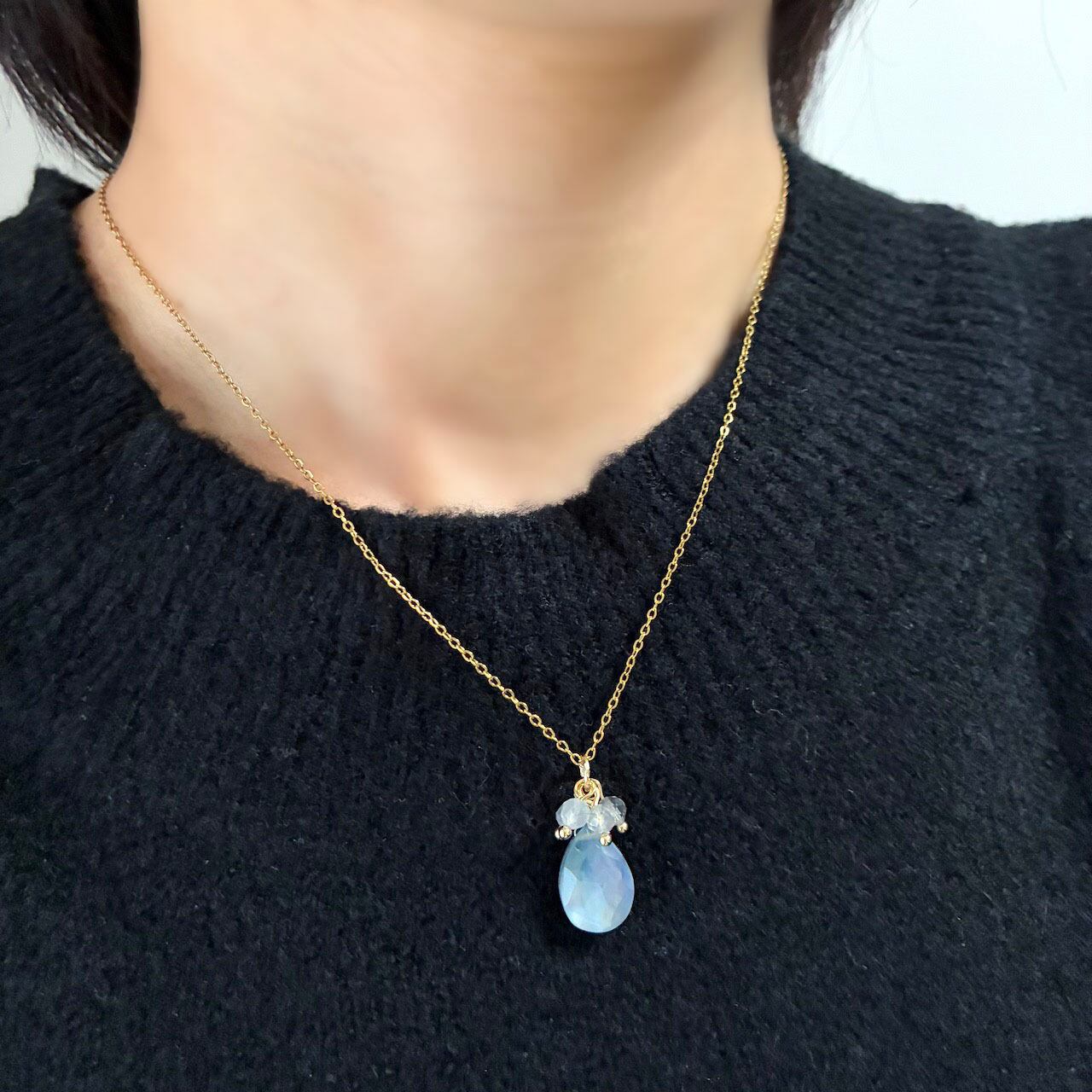 精巧にカットが施されたブルーのシラーが見られる小粒のラブラドライトをあしらい、更に特別感のあるアイテムに仕上げました。
