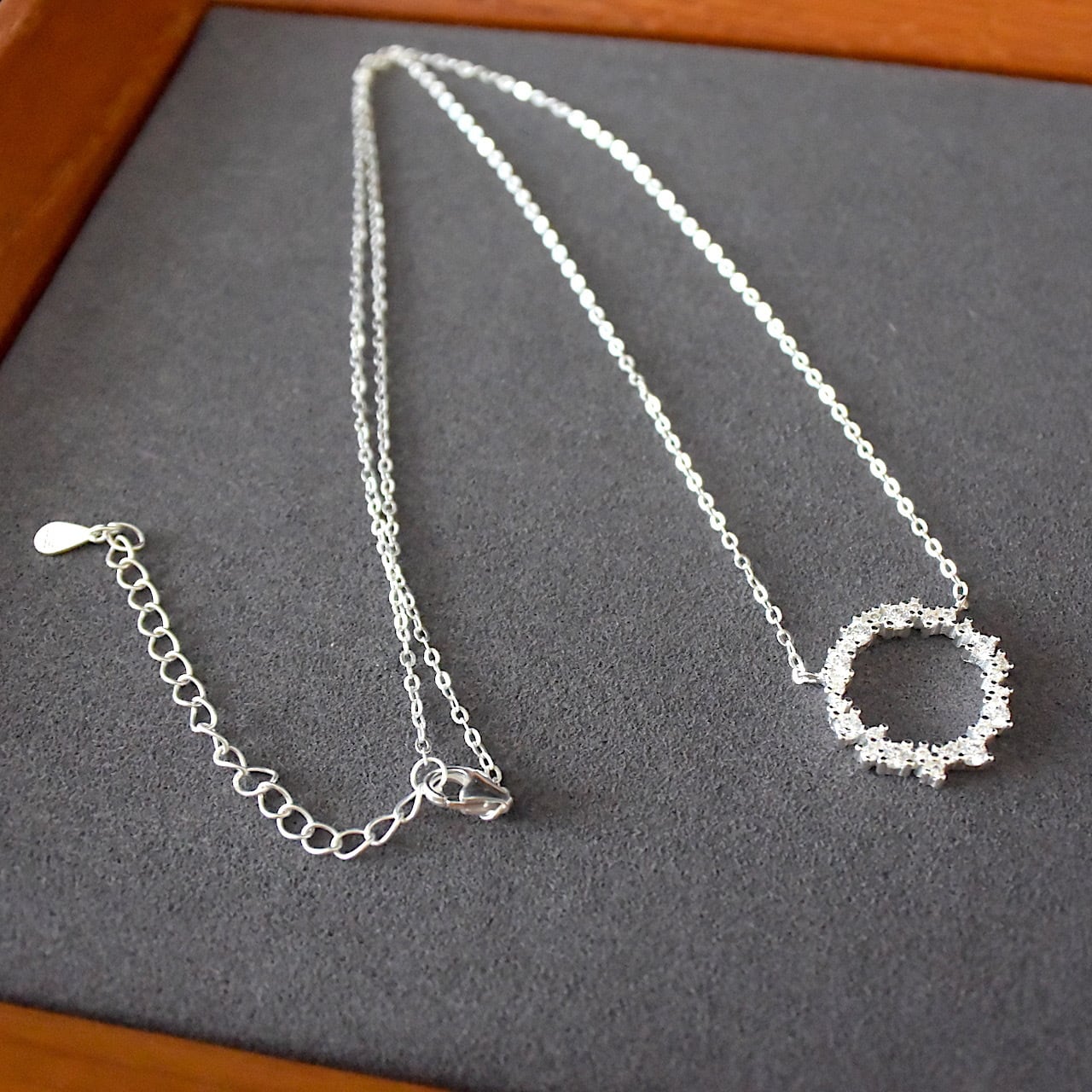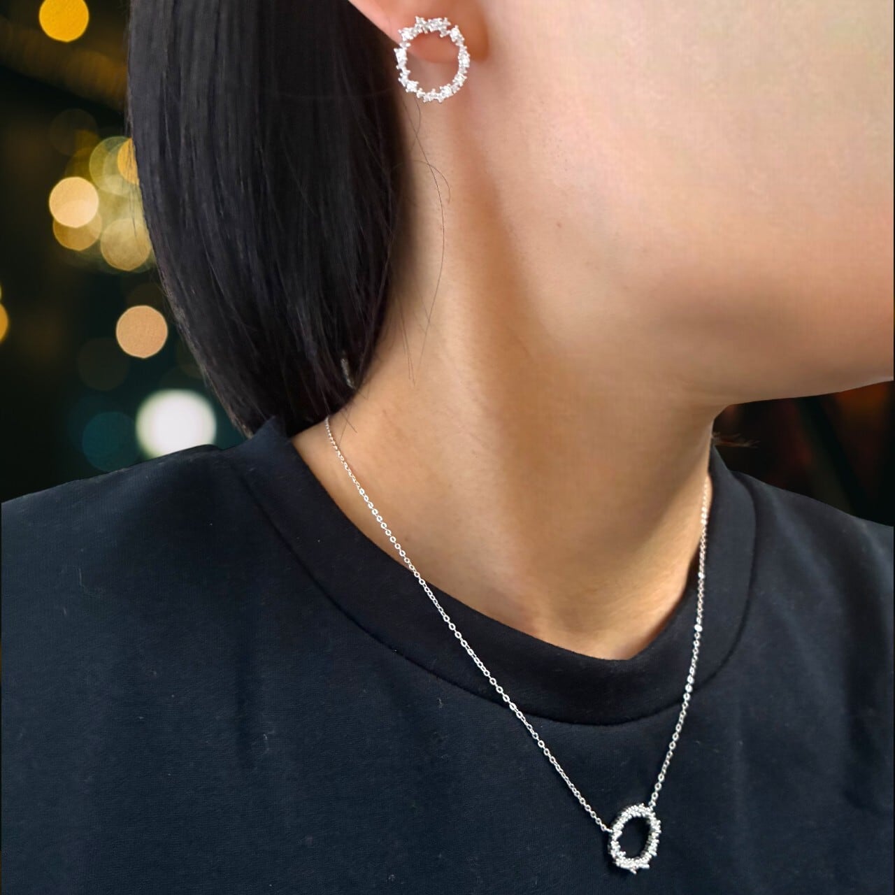 キラキラとしたキュービックジルコニアがリースのように輝く、シンプルで上品な雰囲気のネックレスとピアスのセットです。