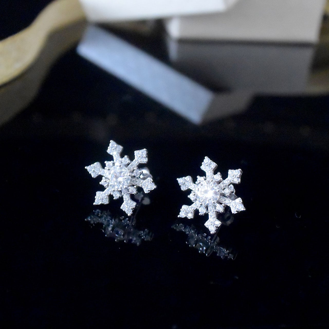 シルバーカラーの雪の結晶のモチーフに、中央にモアサナイト、周囲にジルコニアを散りばめた、ゴージャスな煌めきのピアスです。