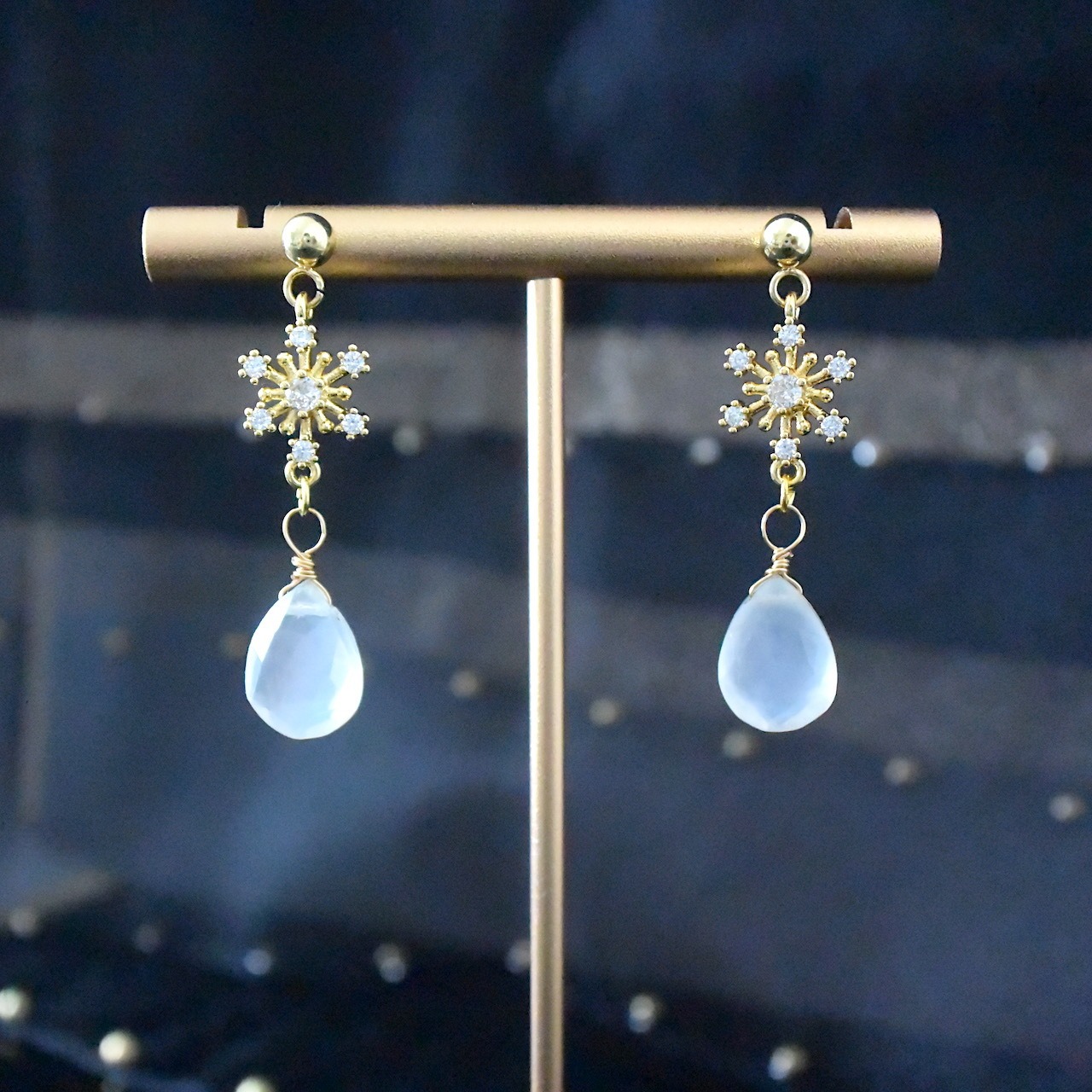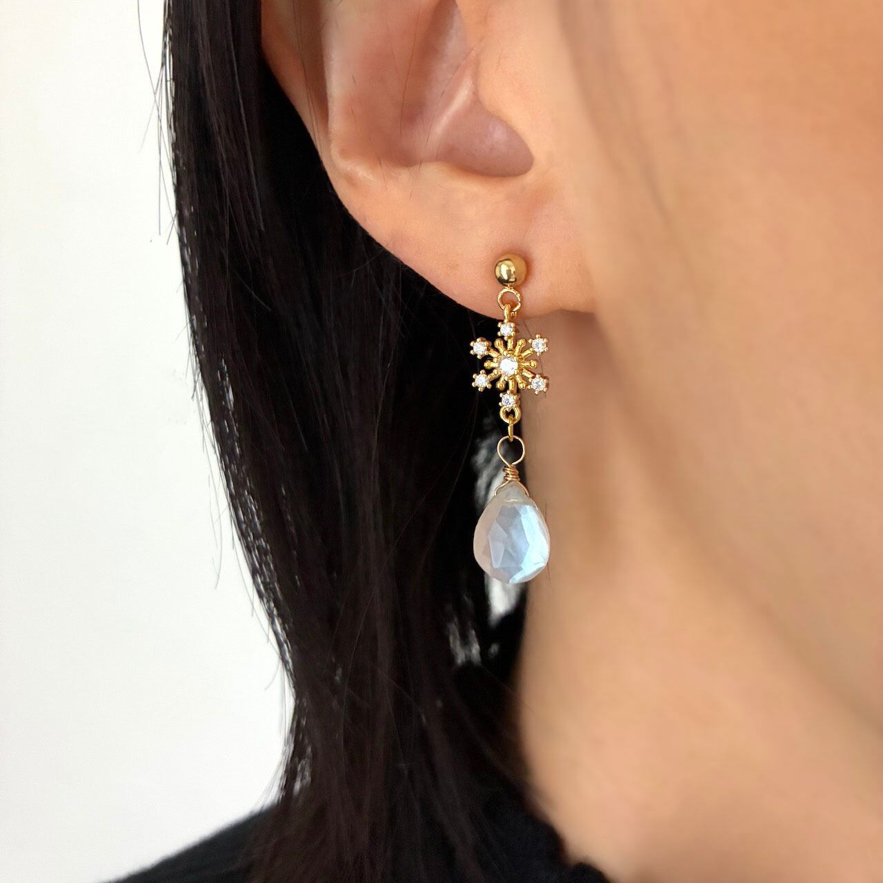雪の雫 雪の結晶とホワイトシェル×クリスタルストーンのピアス サージカルステンレス ゴールド