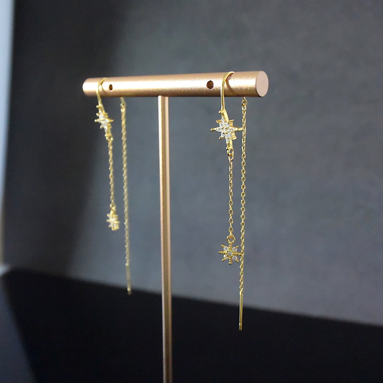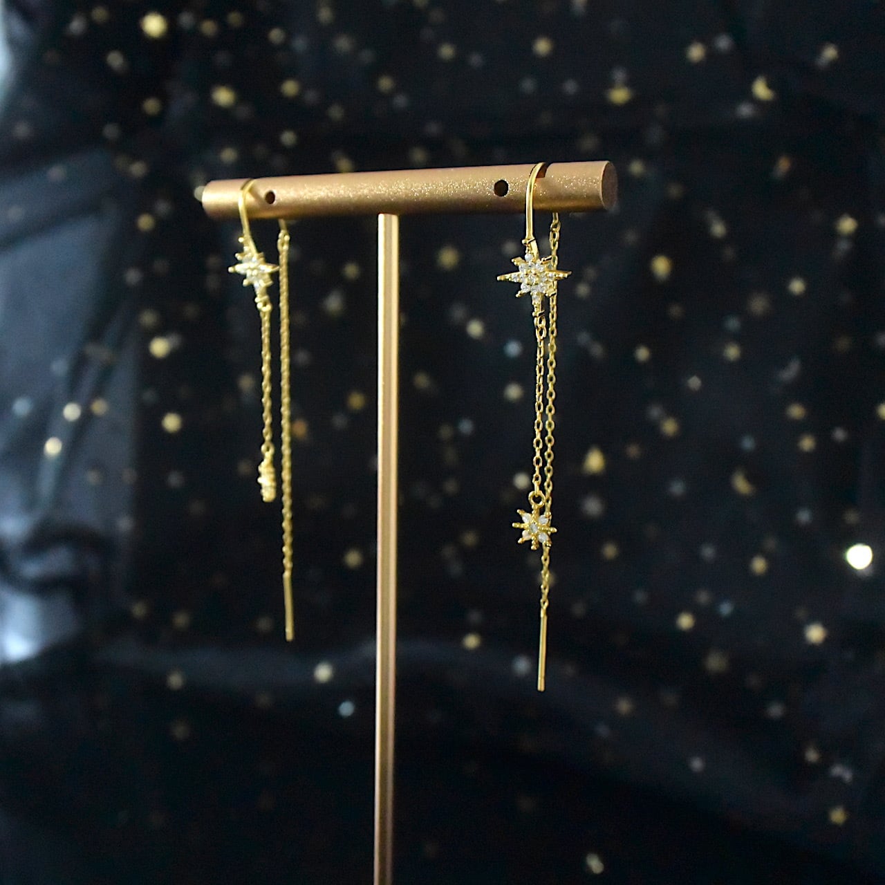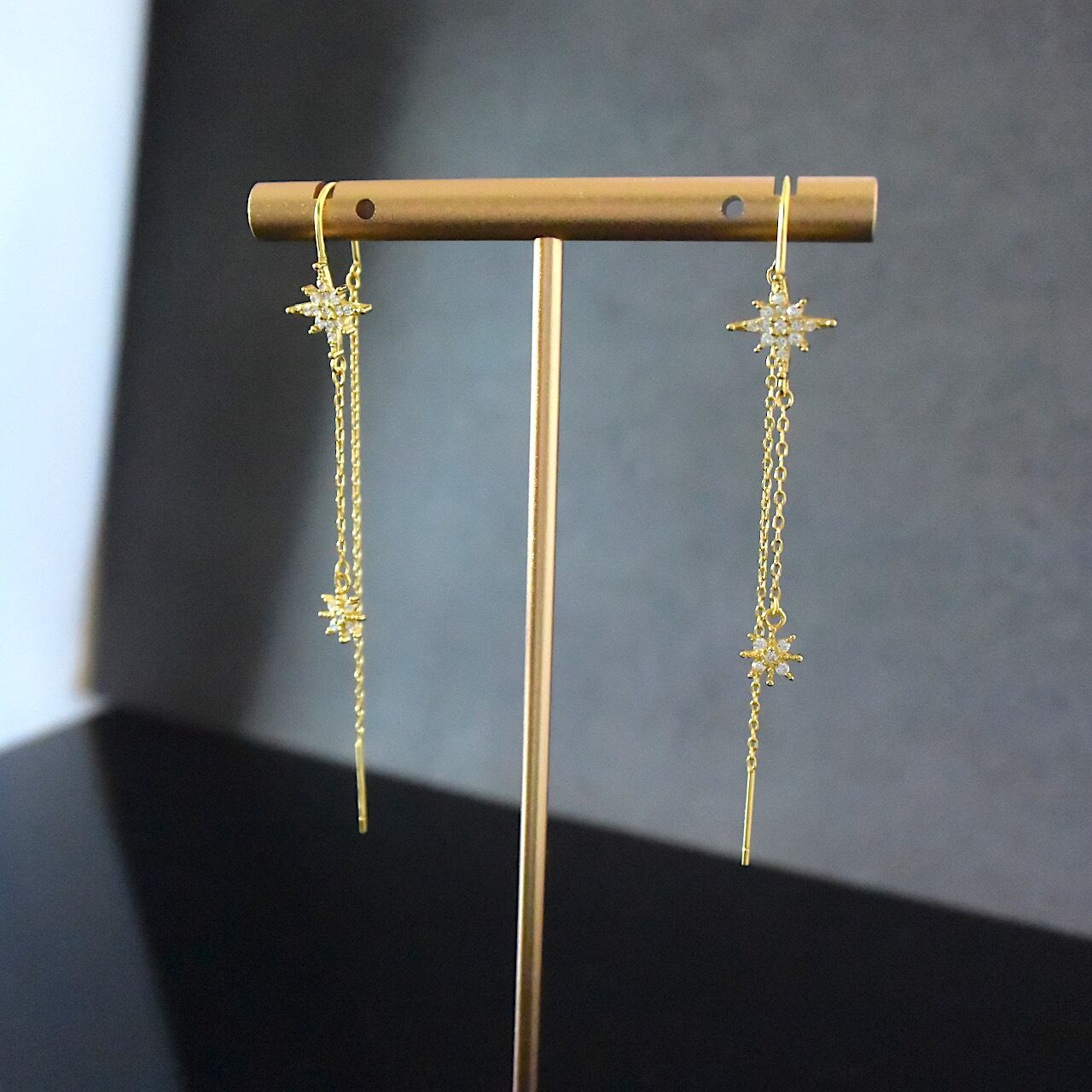 Silver925 連なるジルコニアスターのロングピアス ゴールド