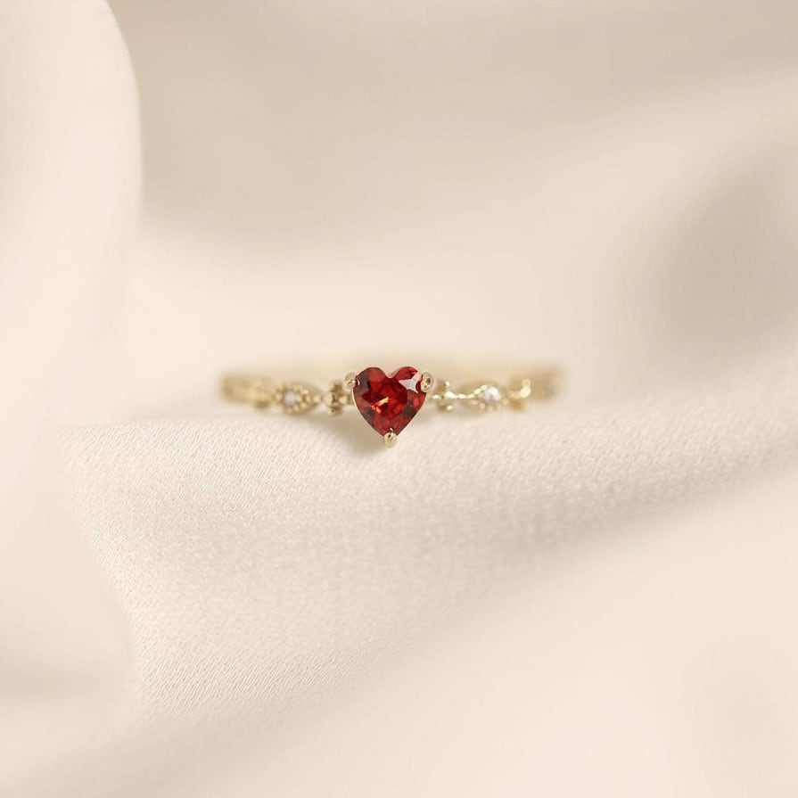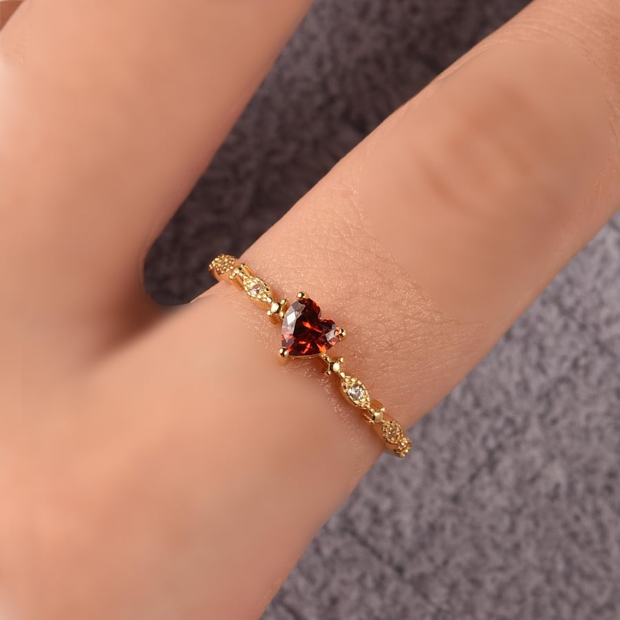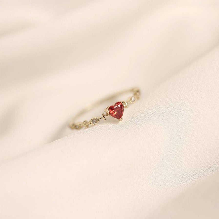 心を惹きつける鮮やかな赤のハート型ジルコニアを使用した、愛らしいデザインのリングです。