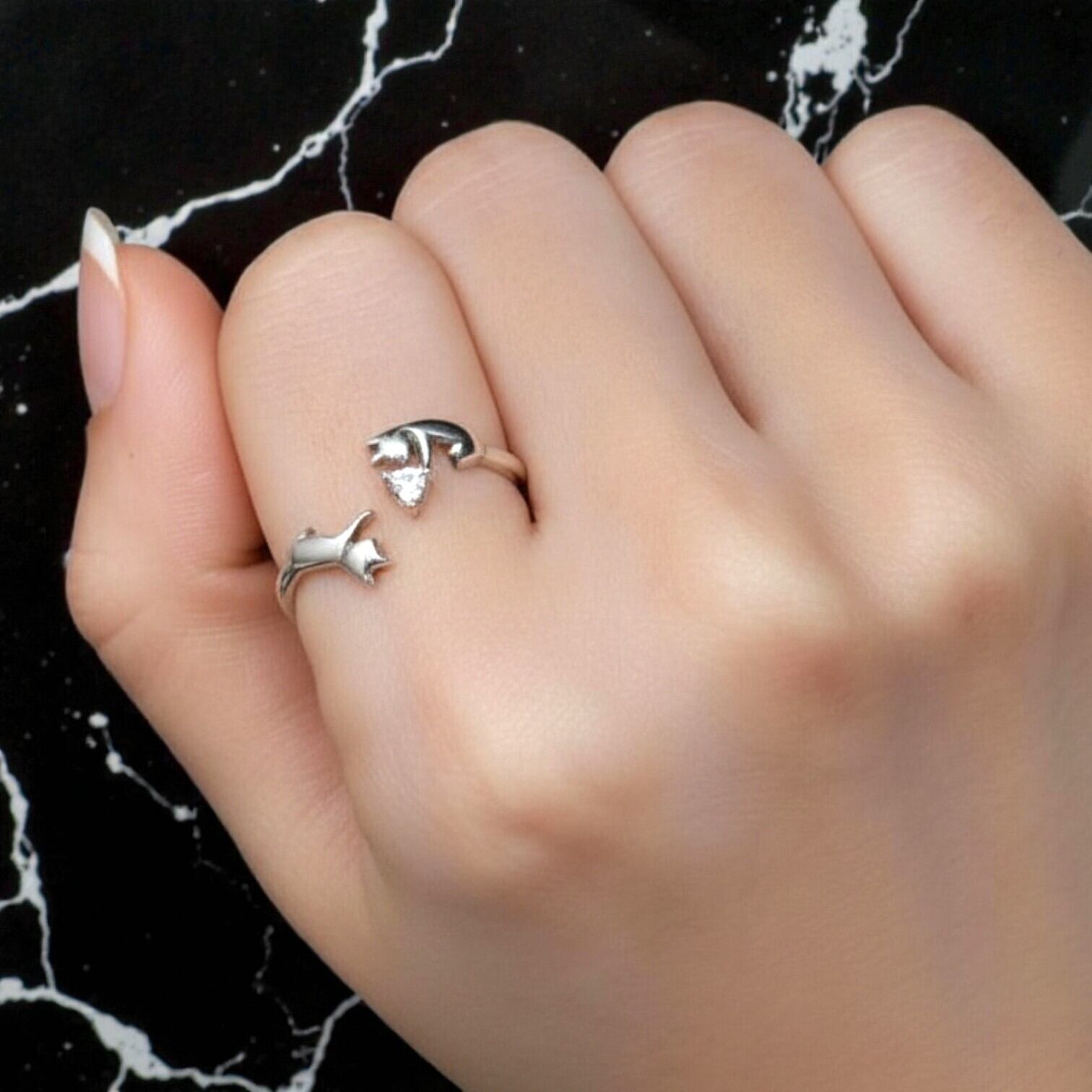 2匹の猫がハートを持って遊んでいるような、見ているだけでも癒やされる可愛らしいリング。