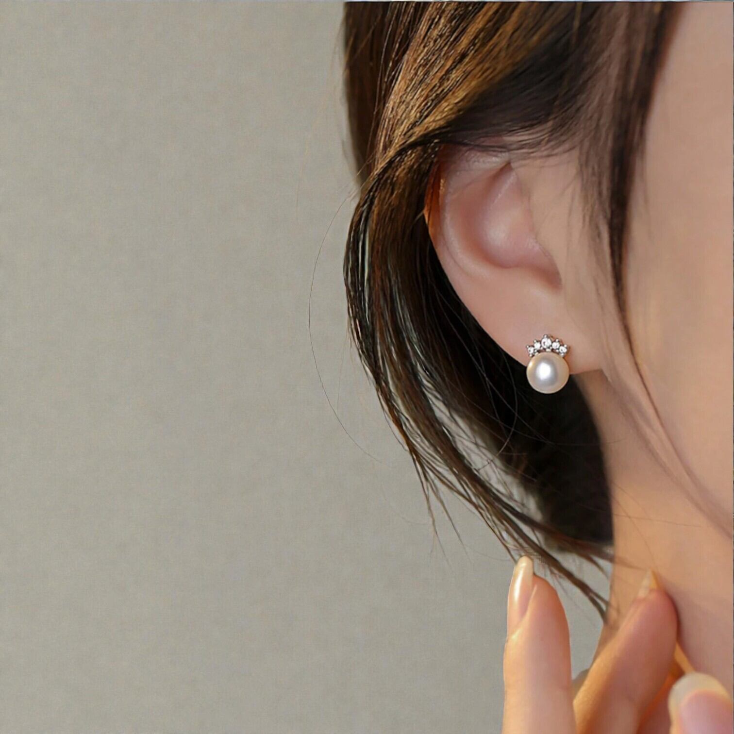 ティアラのような形のキュービックジルコニアの装飾が施されたトップに、上質な淡水パールを組み合わせた、上品で華やかな雰囲気のピアスです。