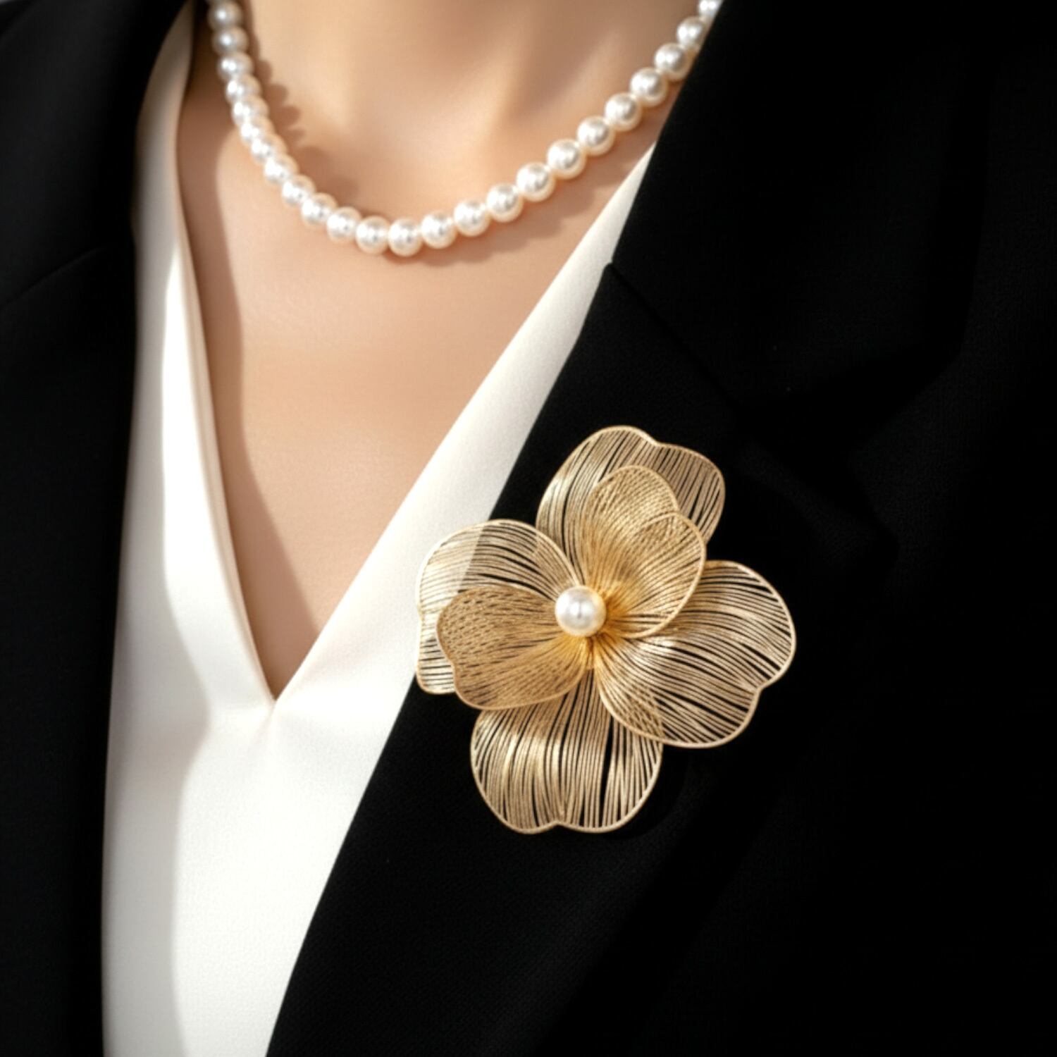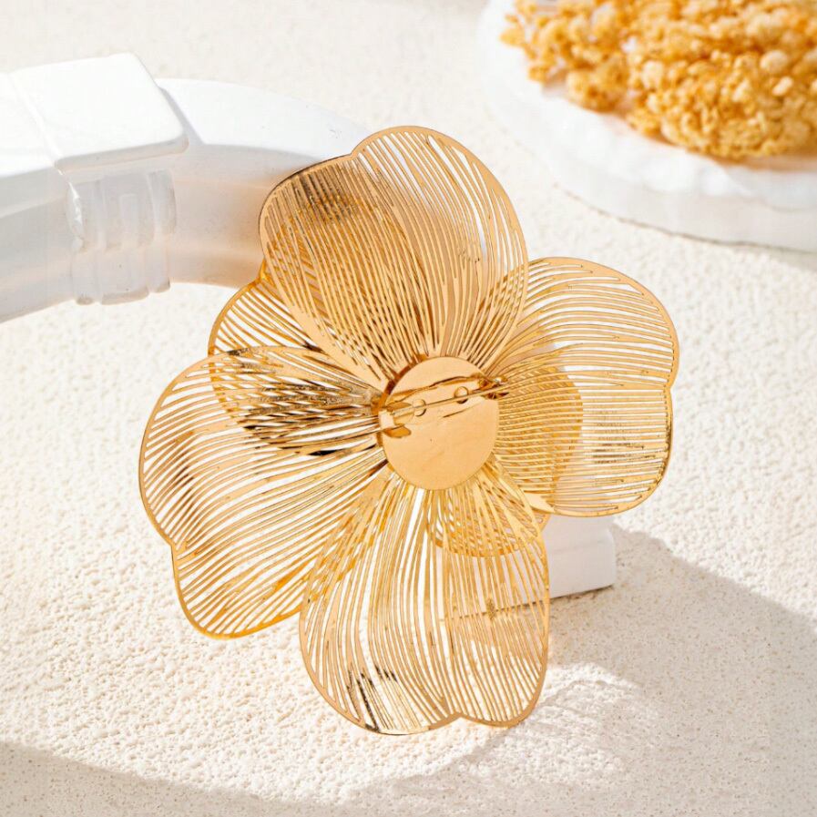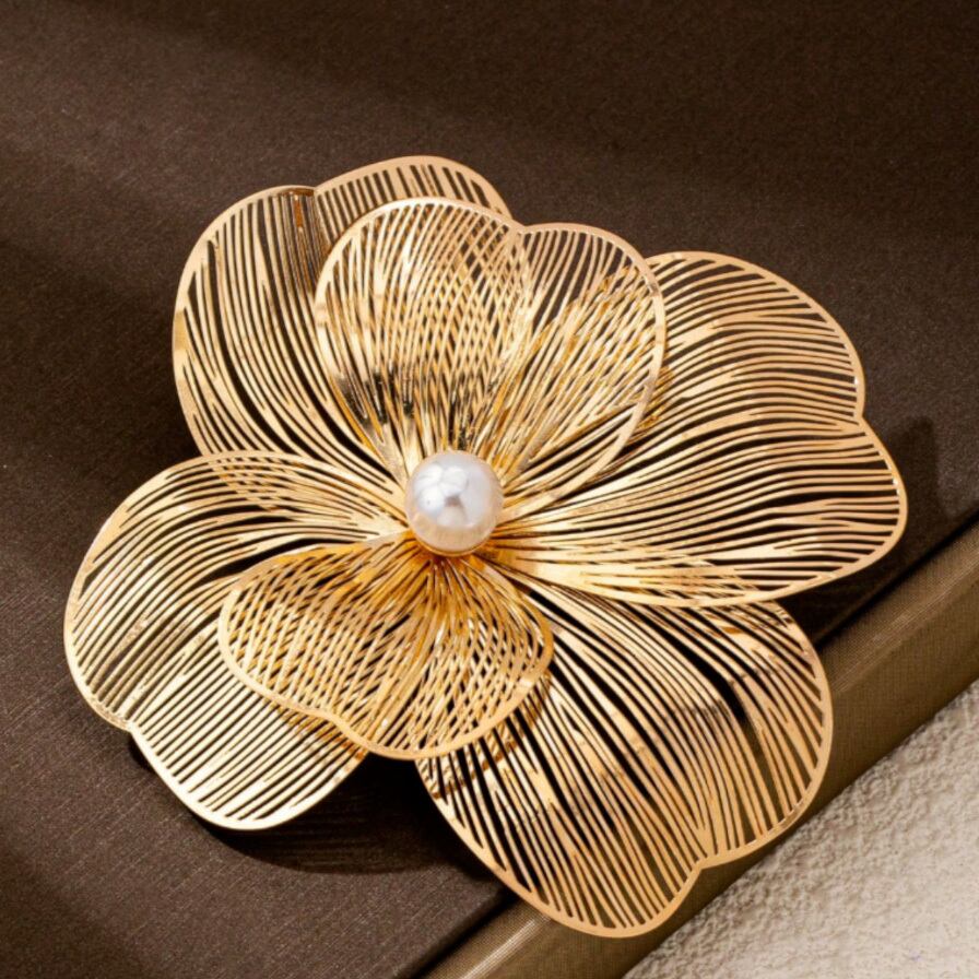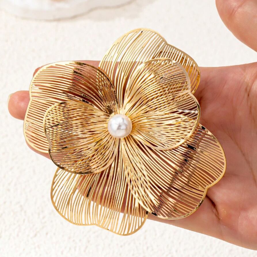 ゴールドの透かし模様のお花のモチーフに、パールを合わせたトレンド感のあるブローチです。
