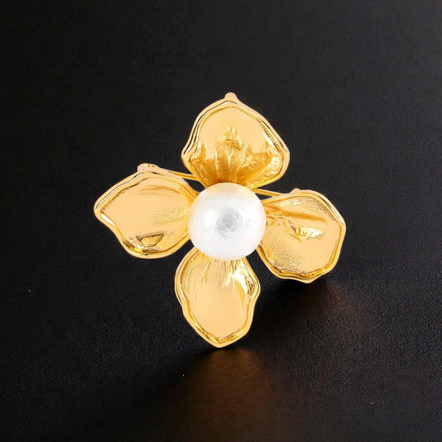 マットゴールドの精巧な花びらと、真ん中に大ぶりのコットンパールを配置してフォーマルな雰囲気に仕上げたブローチです。