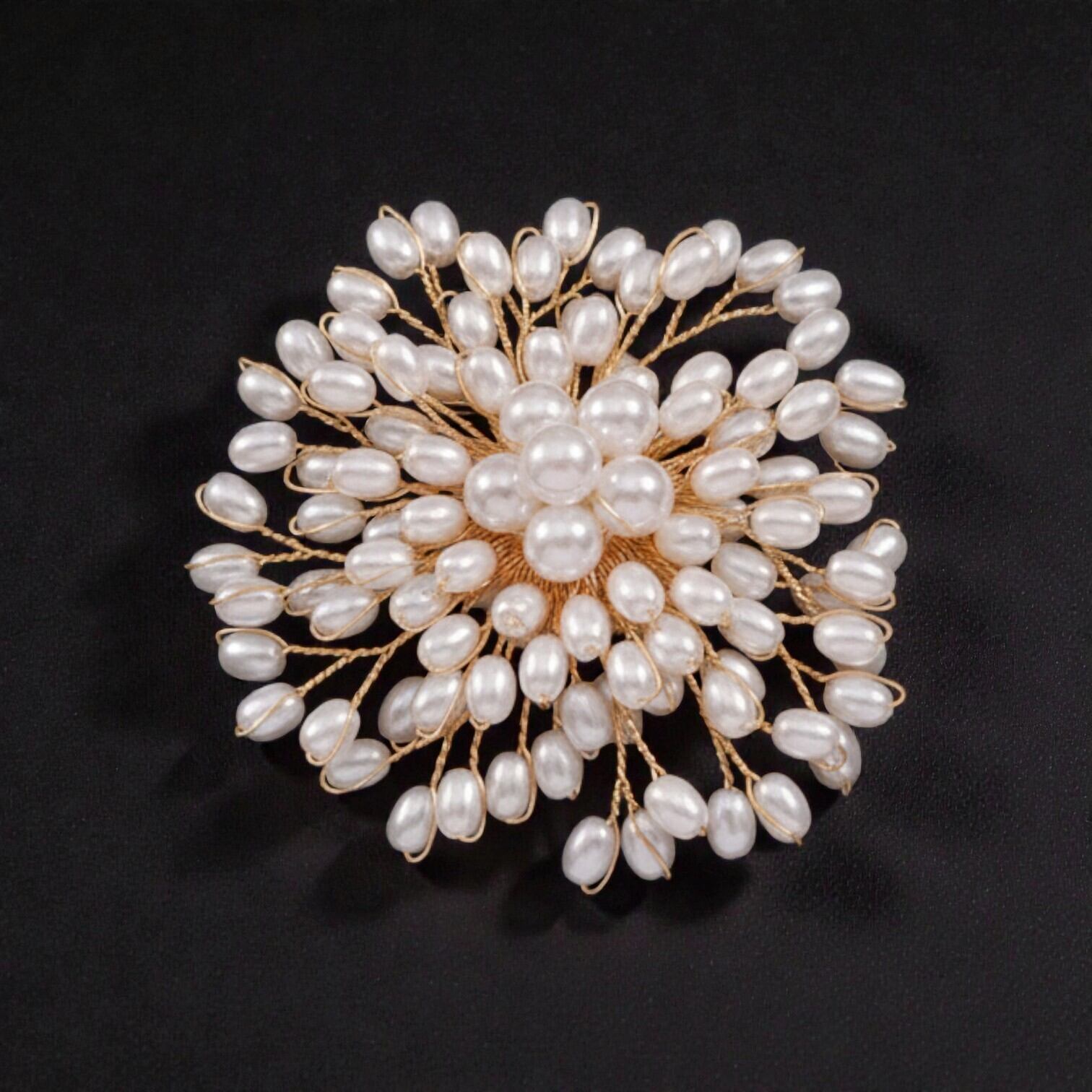ワイヤーで編まれたパールが花のように放射線状に広がった華やかなブローチ。