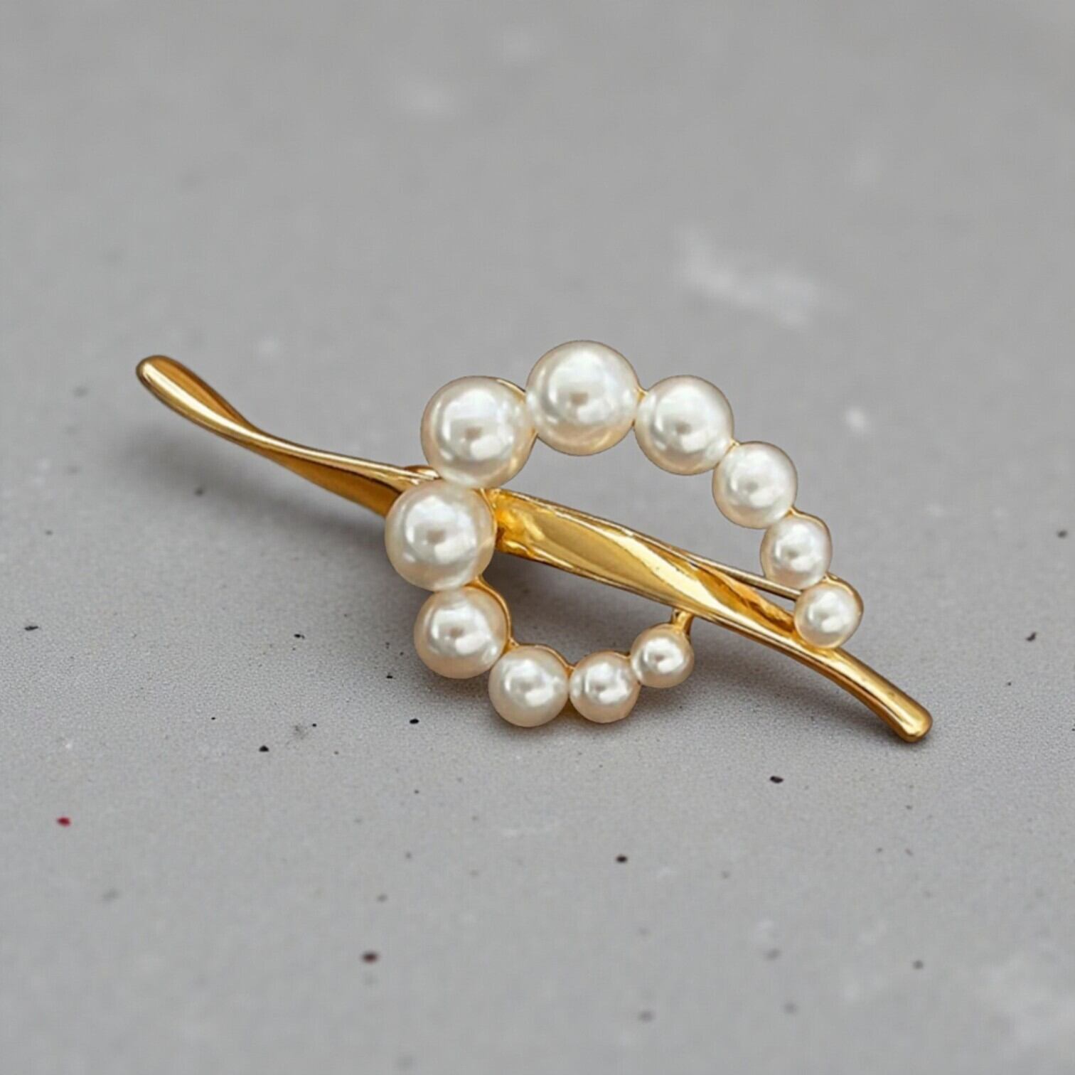 流線型のバーをパールが囲むようにデザインされた、スタイリッシュな形のブローチ。
