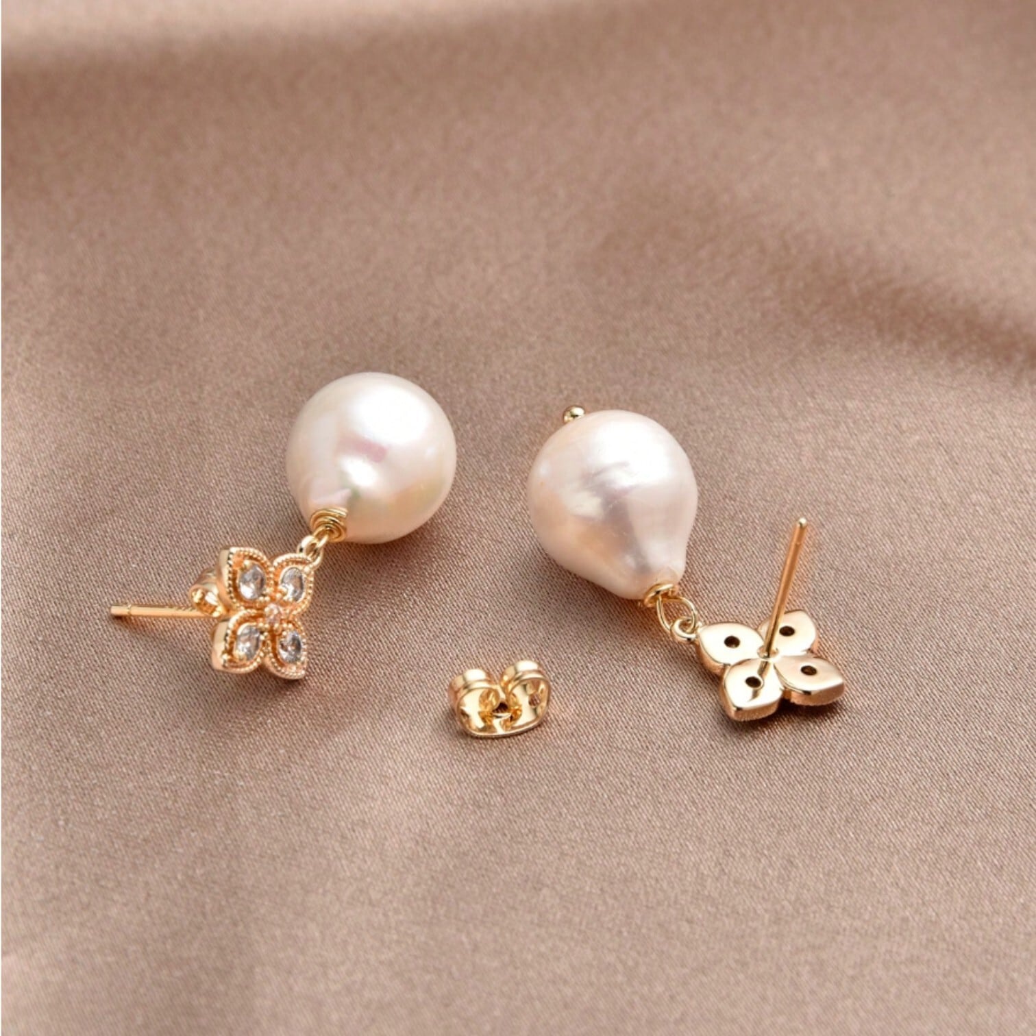 四つ葉のクローバーのモチーフに、大きなしずく型のバロックパールを合わせたエレガントなピアスです。