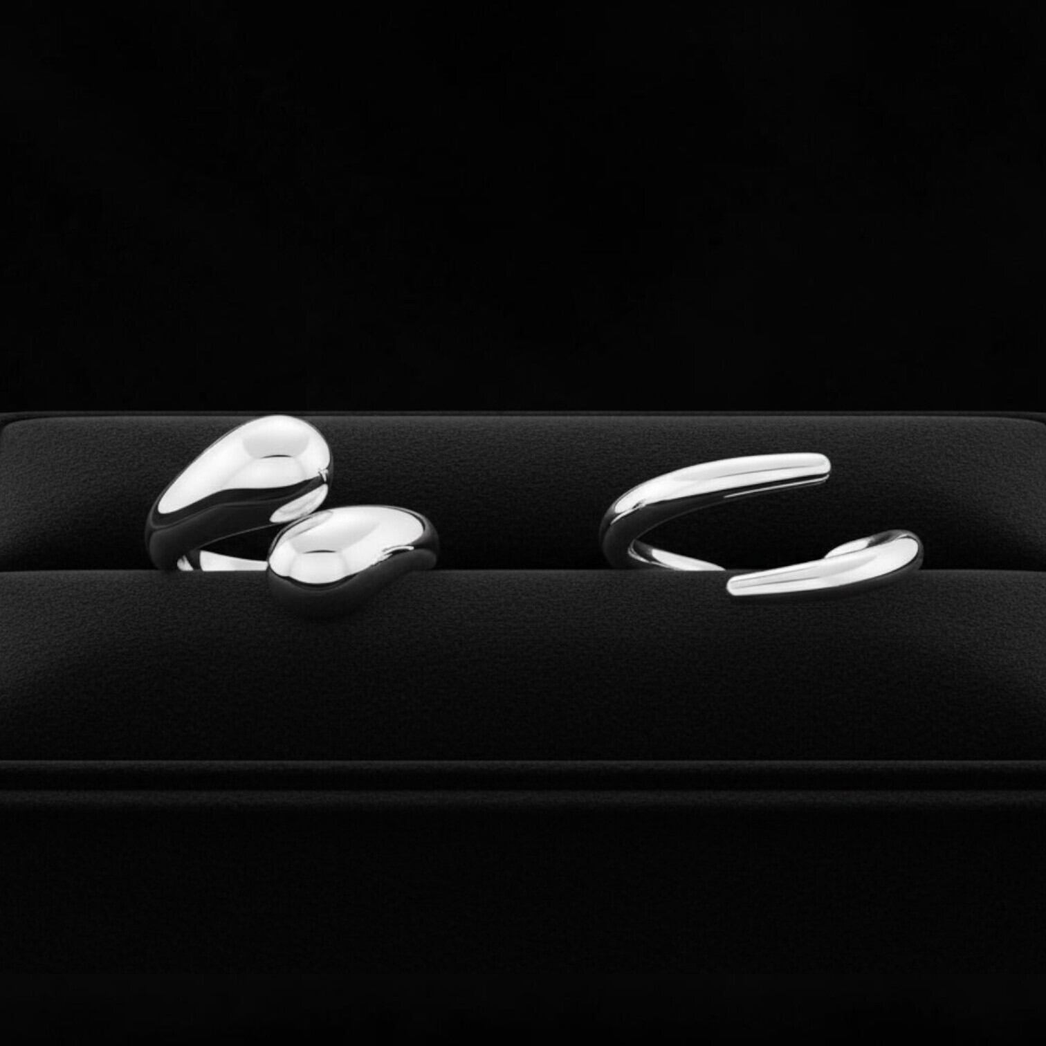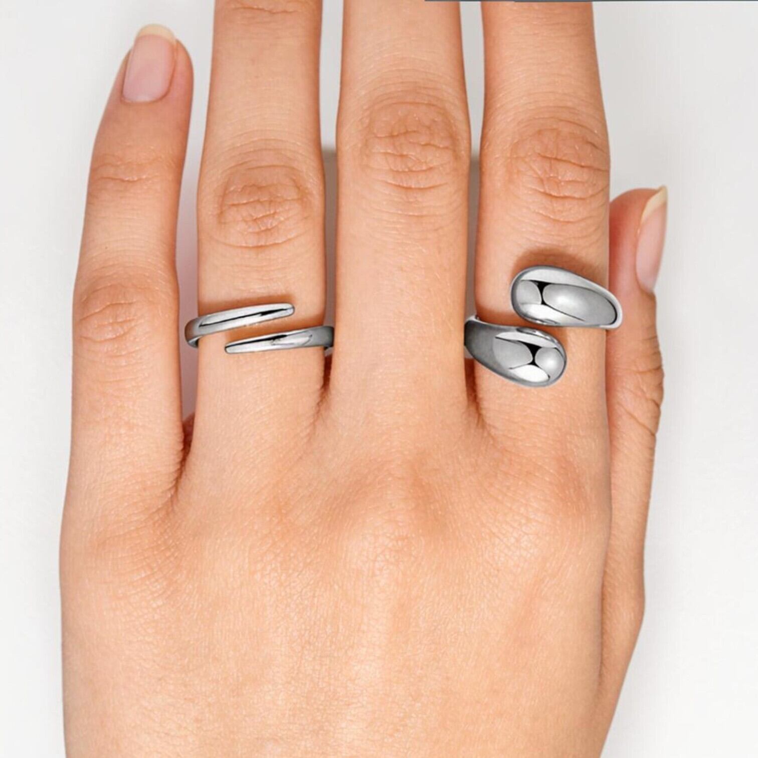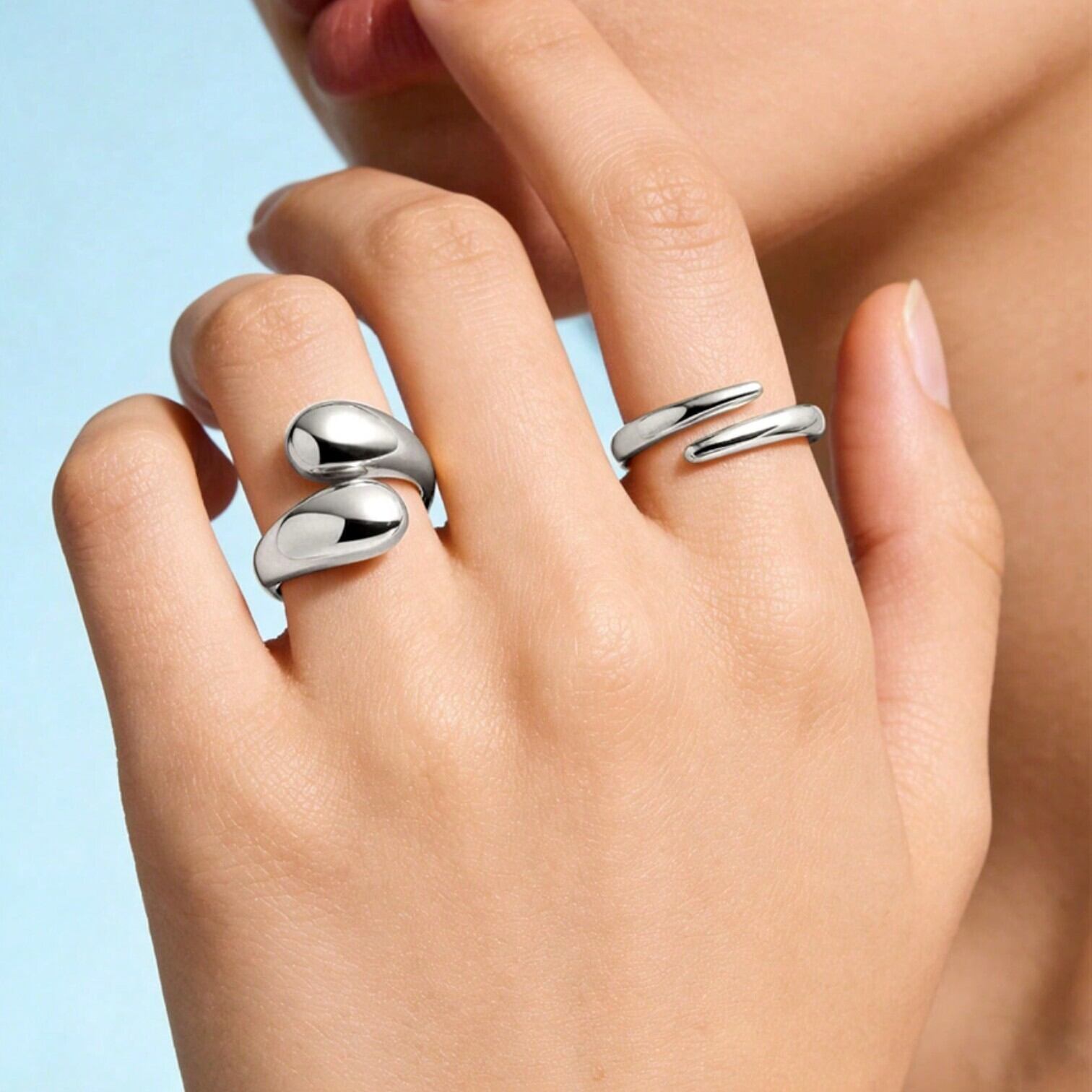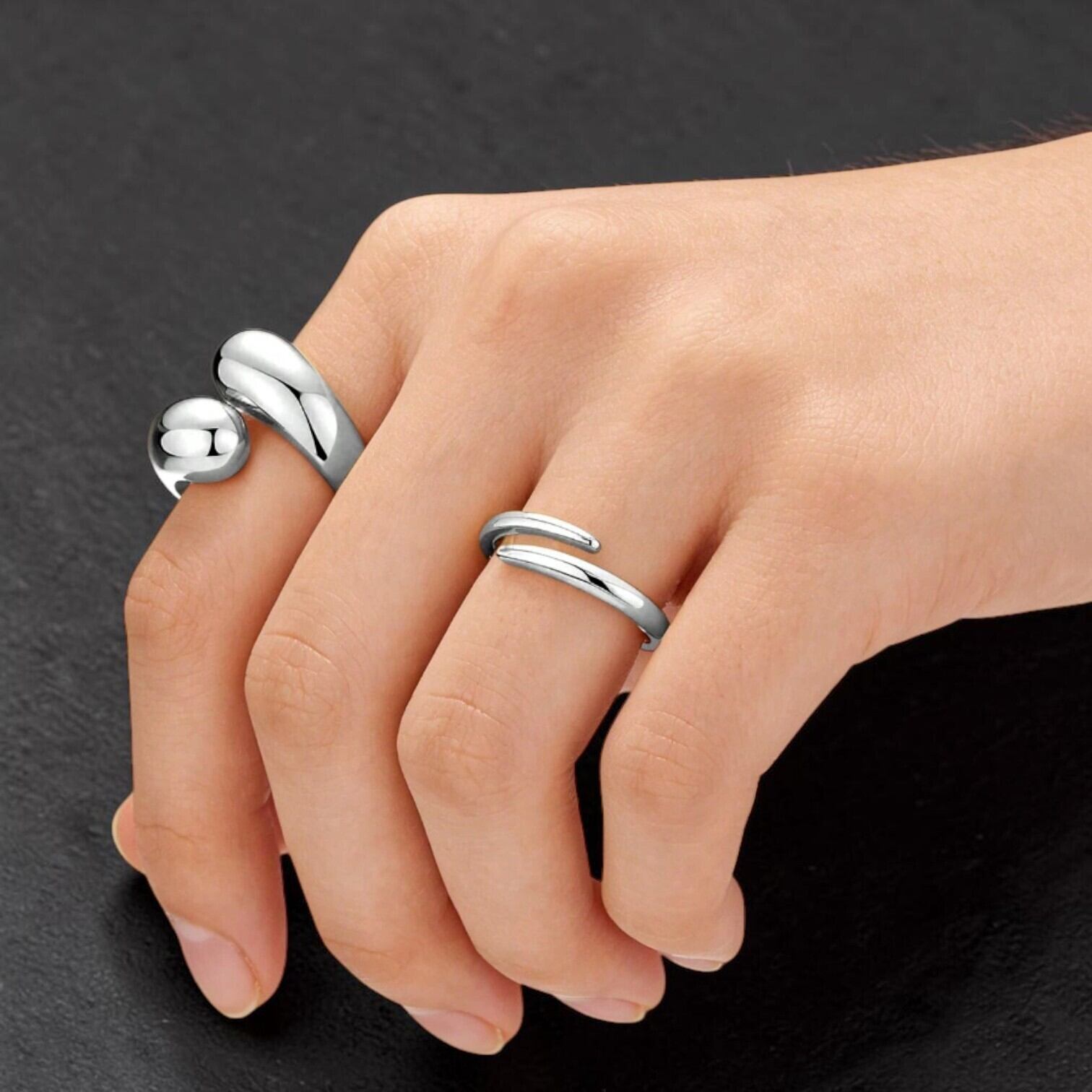 使い勝手の良いシンプルなデザインの太めのボリュームリングと、華奢で細めのリングの調節可能なオープンリングの2点セットです。