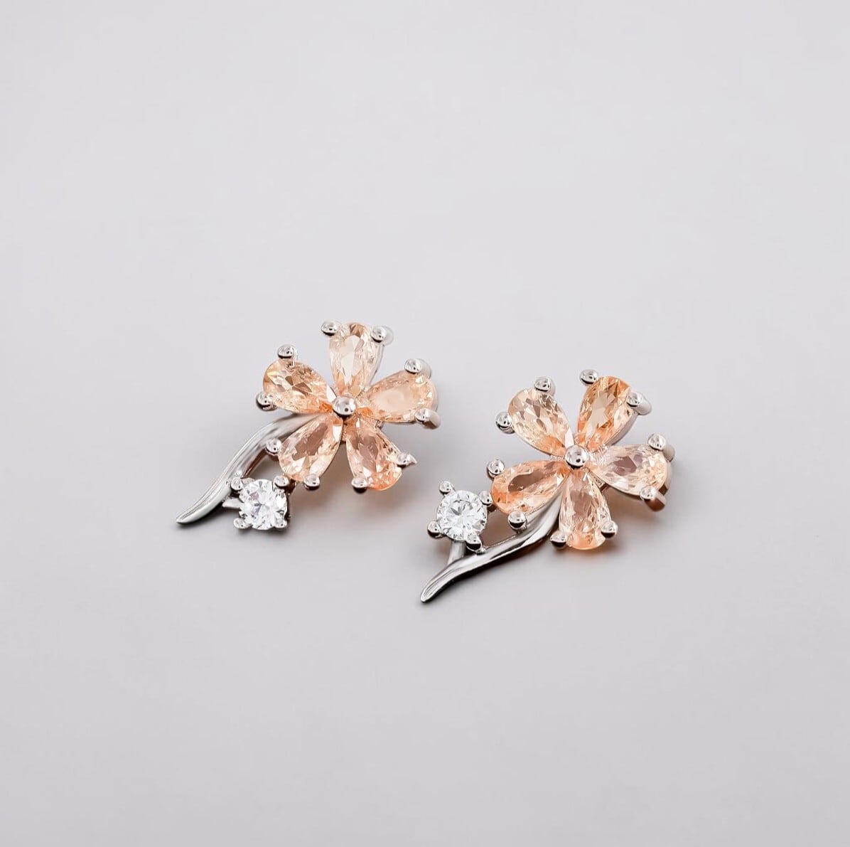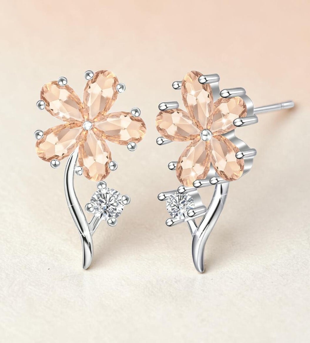 ピンクの花をかたどった、ジルコニアが美しく輝く高級感のあるピアス。
