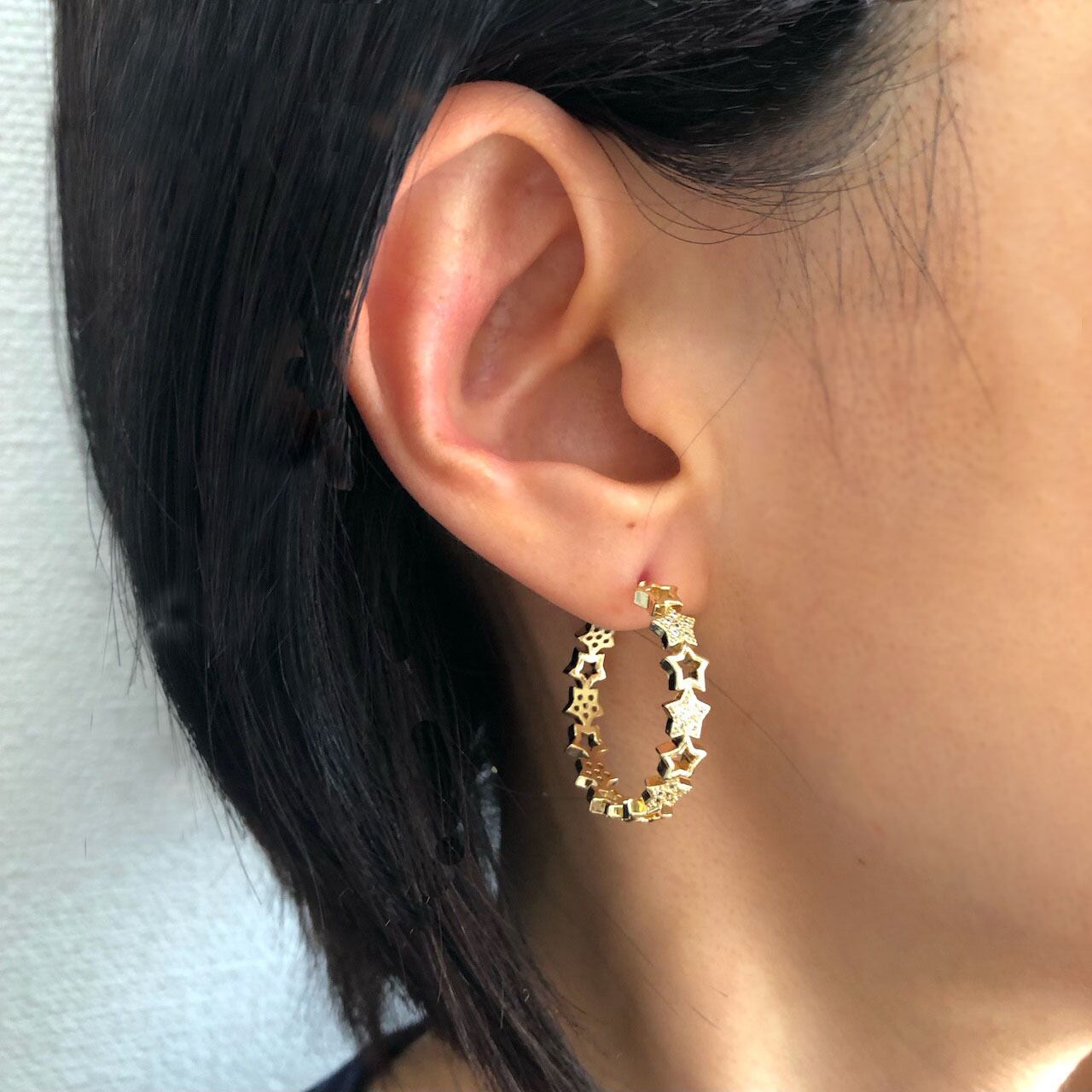 大きめのハーフフープに、キュービックジルコニアのスターとフレーム型のスターが交互に並んだ、スタイリッシュかつ可愛らしい雰囲気のピアスです。