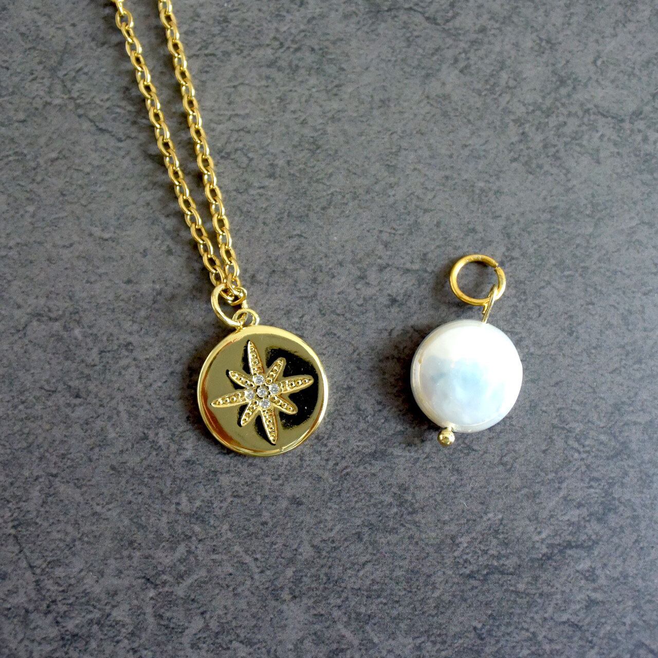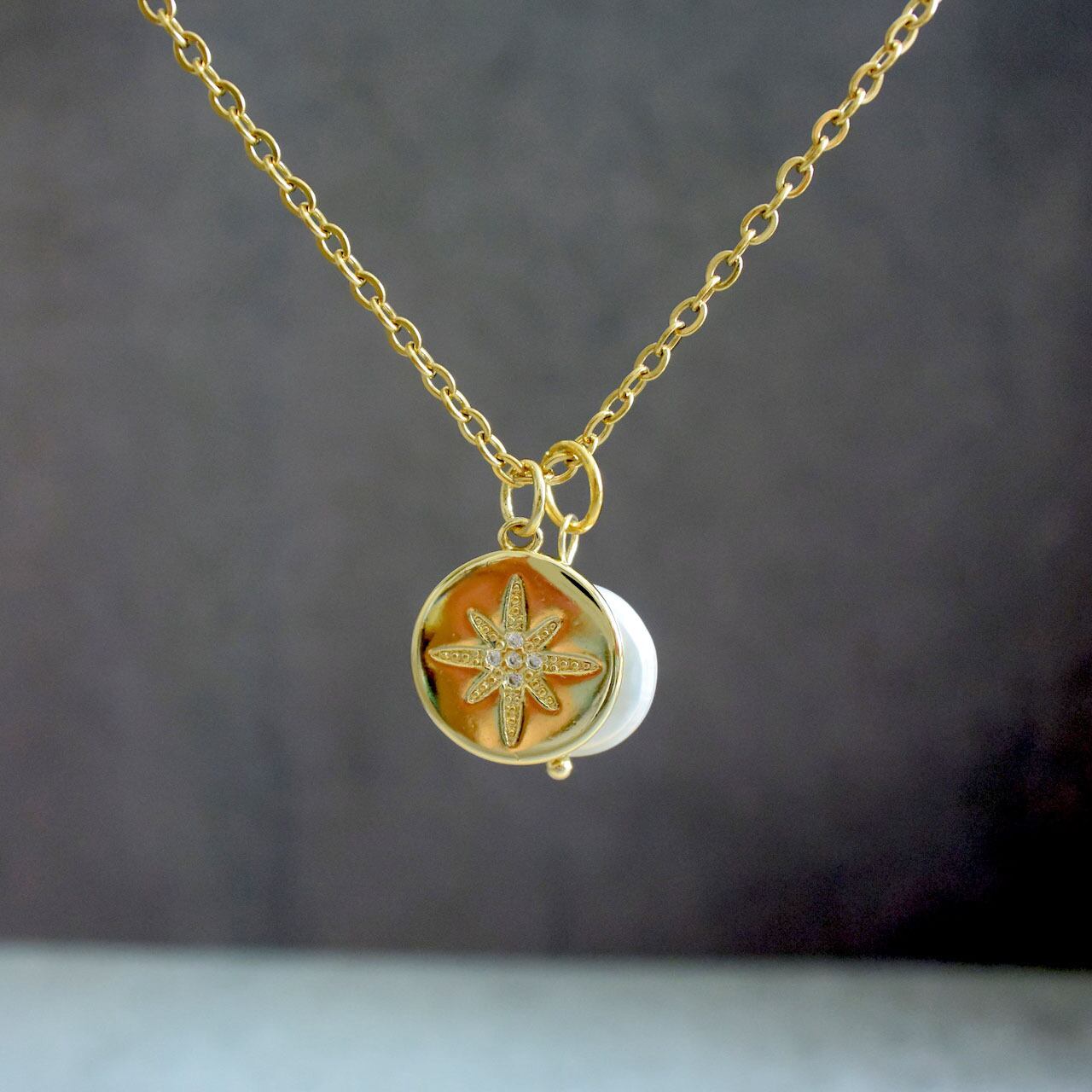 ジルコニアの八芒星が埋め込まれたコインチャームと、同じくらいの大きさのコイン型の淡水バロックパールのチャームを合わせた、上品な雰囲気のネックレスです。