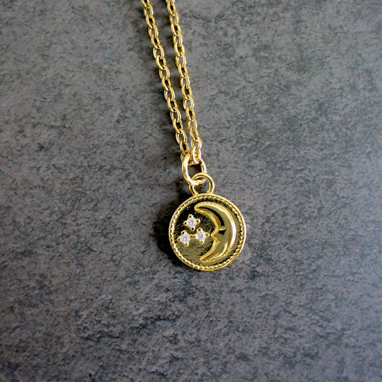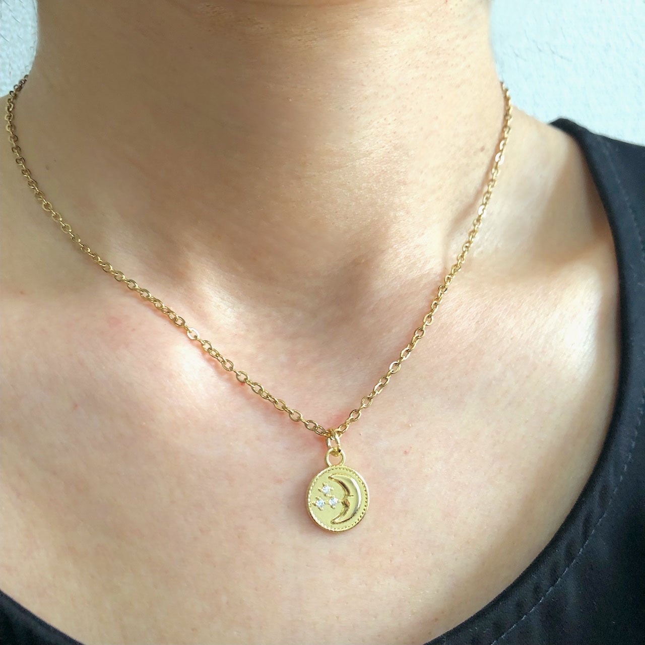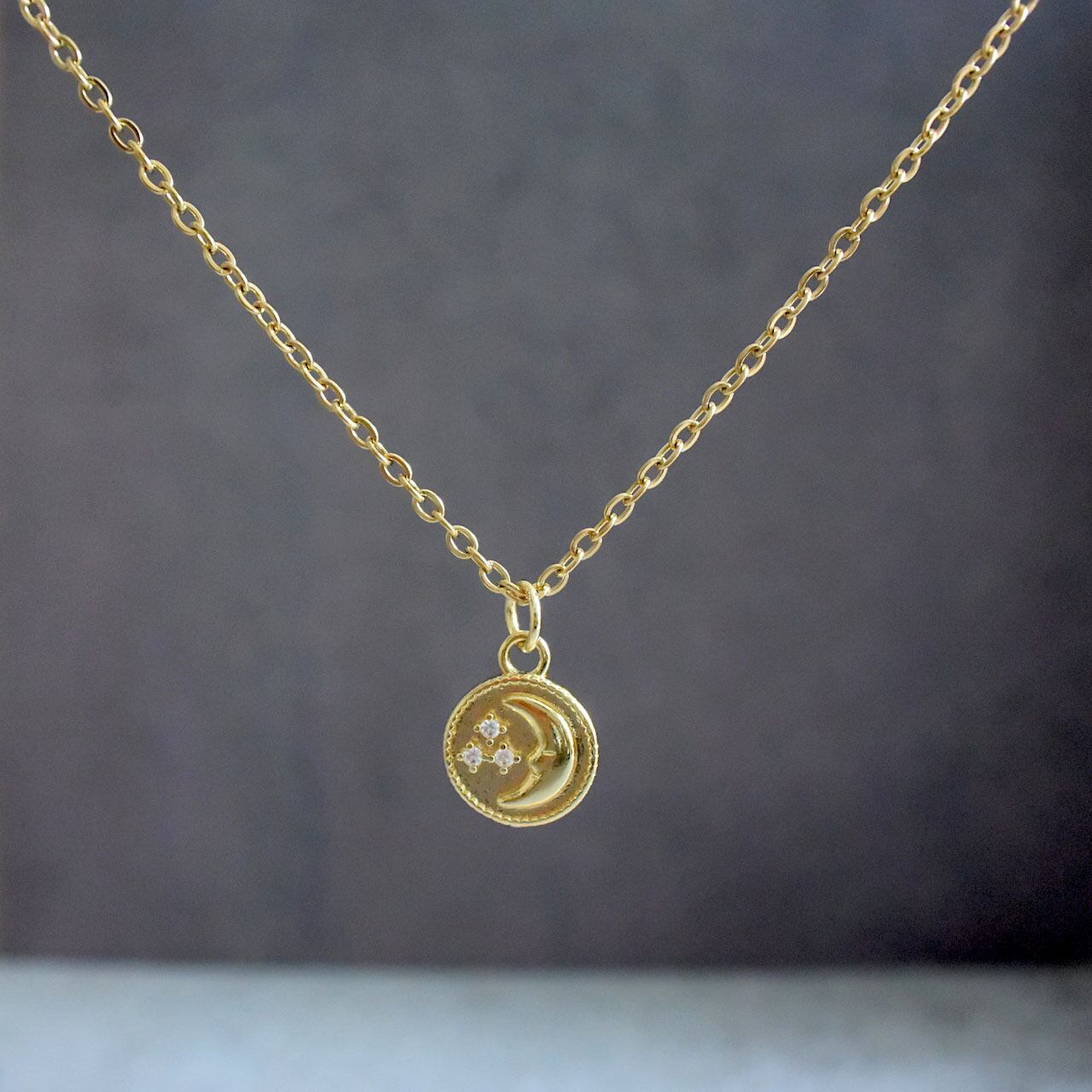 キラキラと光るジルコニアの星と、かわらしいお月さまのモチーフが魅力のコイン型のネックレスです。