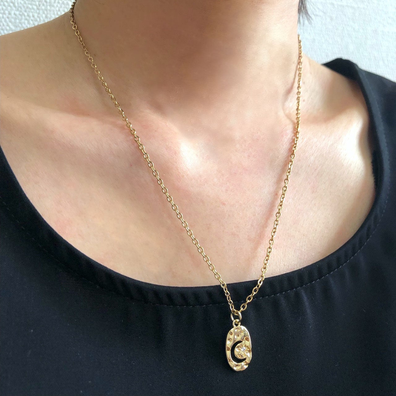 槌目のオーバルコインにくり抜かれた三日月とキラキラと光るジルコニアの星が、ミニマムでクラフトテイストなネックレスです。
