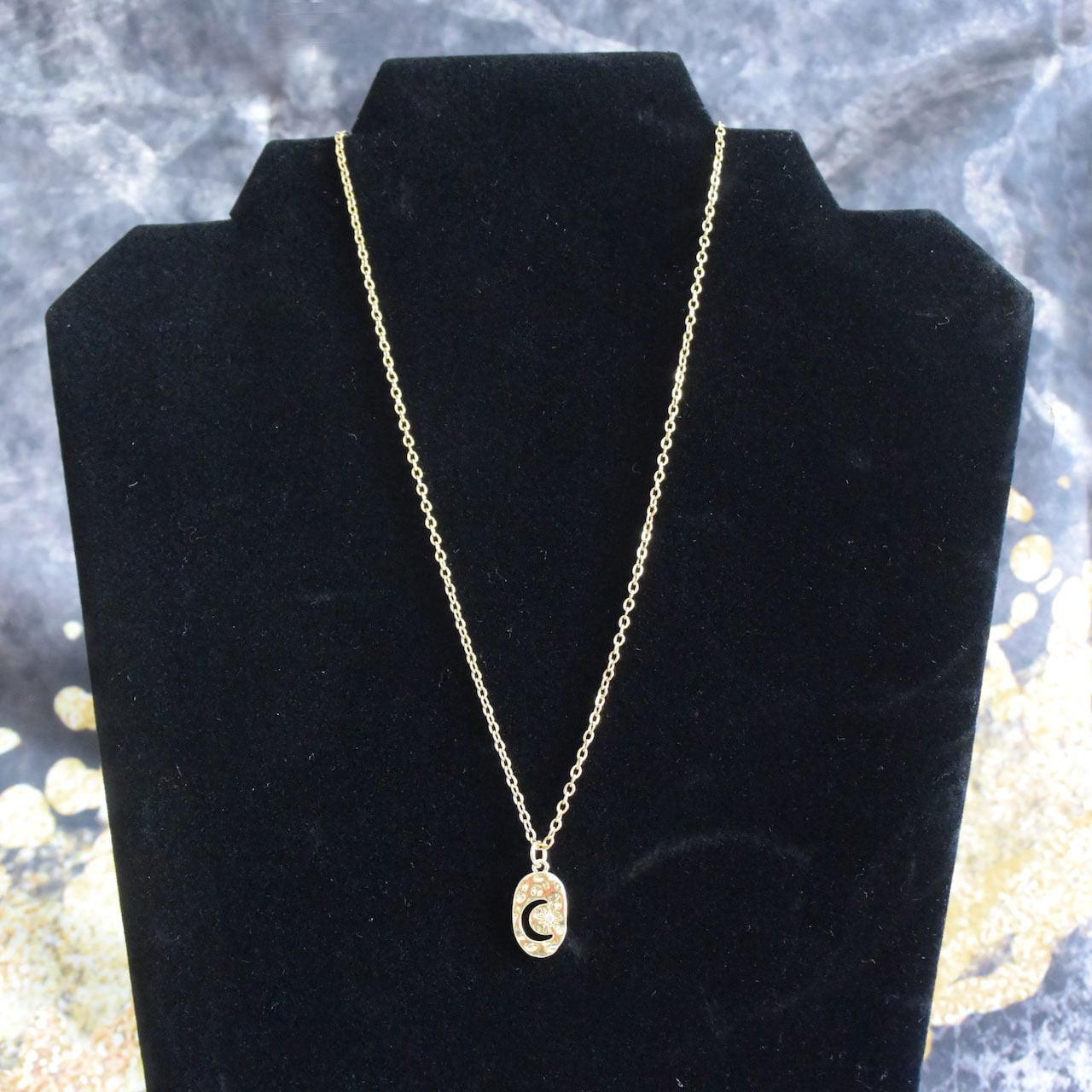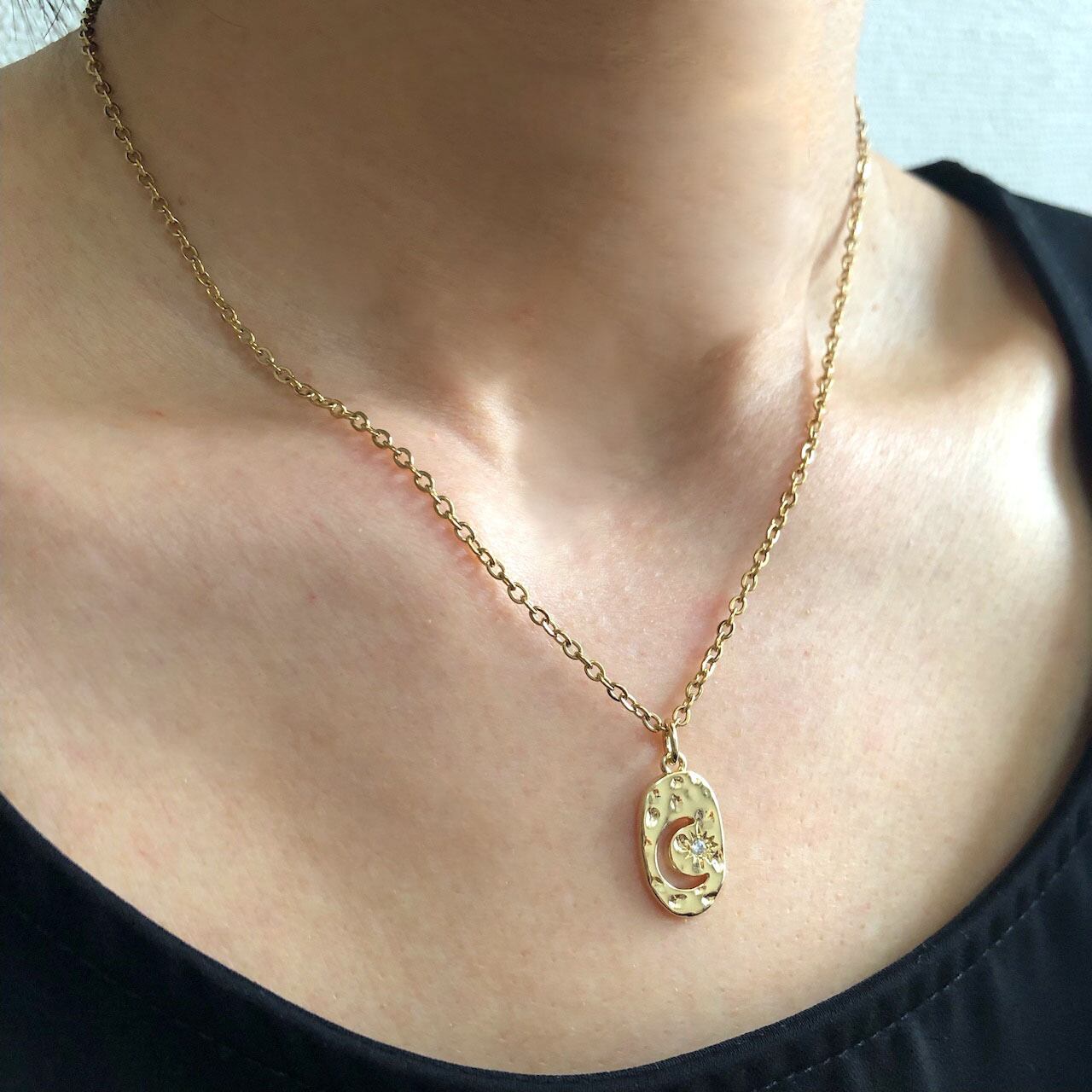 月と星のオーバルコインネックレス ステンレスチェーン ゴールド ハンドメイド