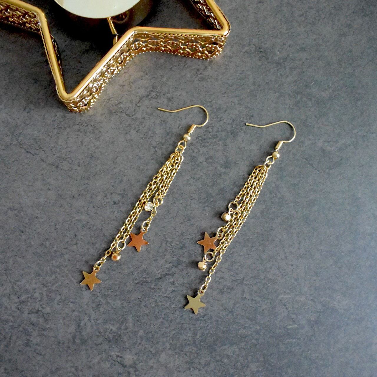 星のモチーフと、キュービックジルコニアのチャームが交互にチェーンにぶら下がった、流れ星のようなゴージャスなロングピアスです。