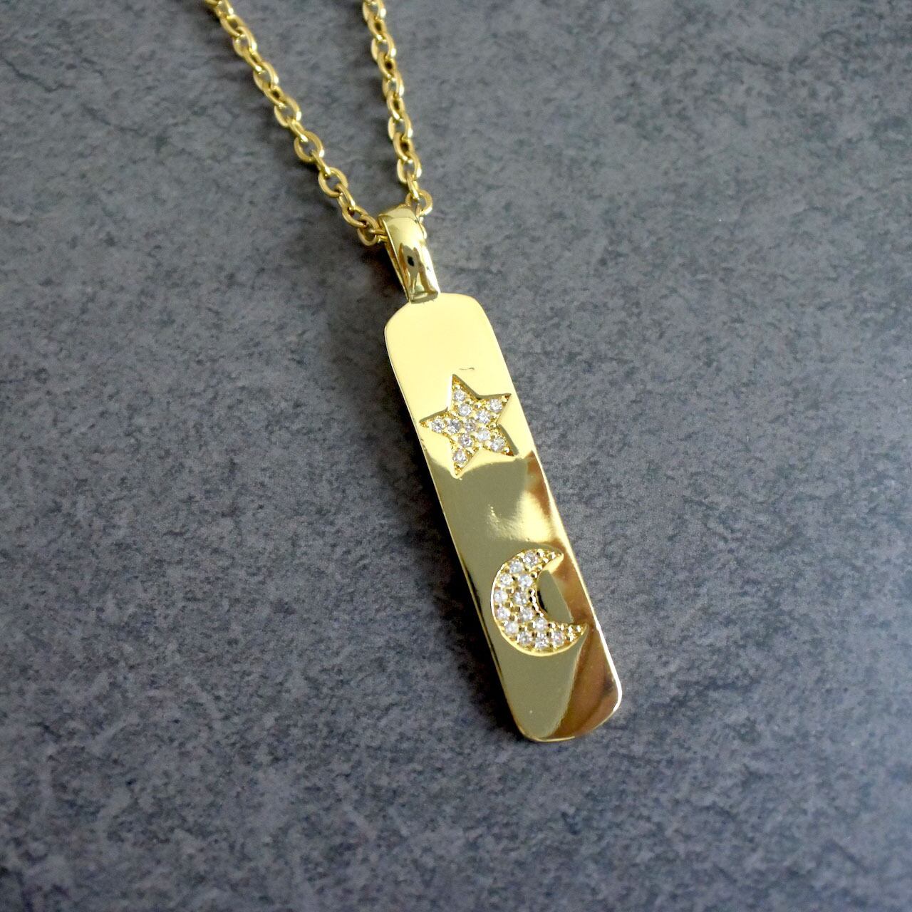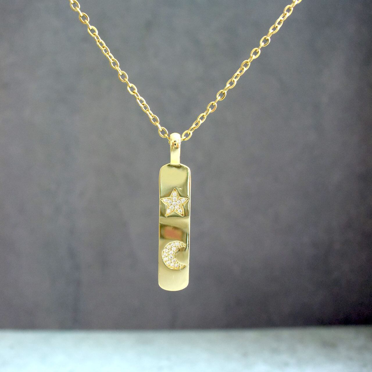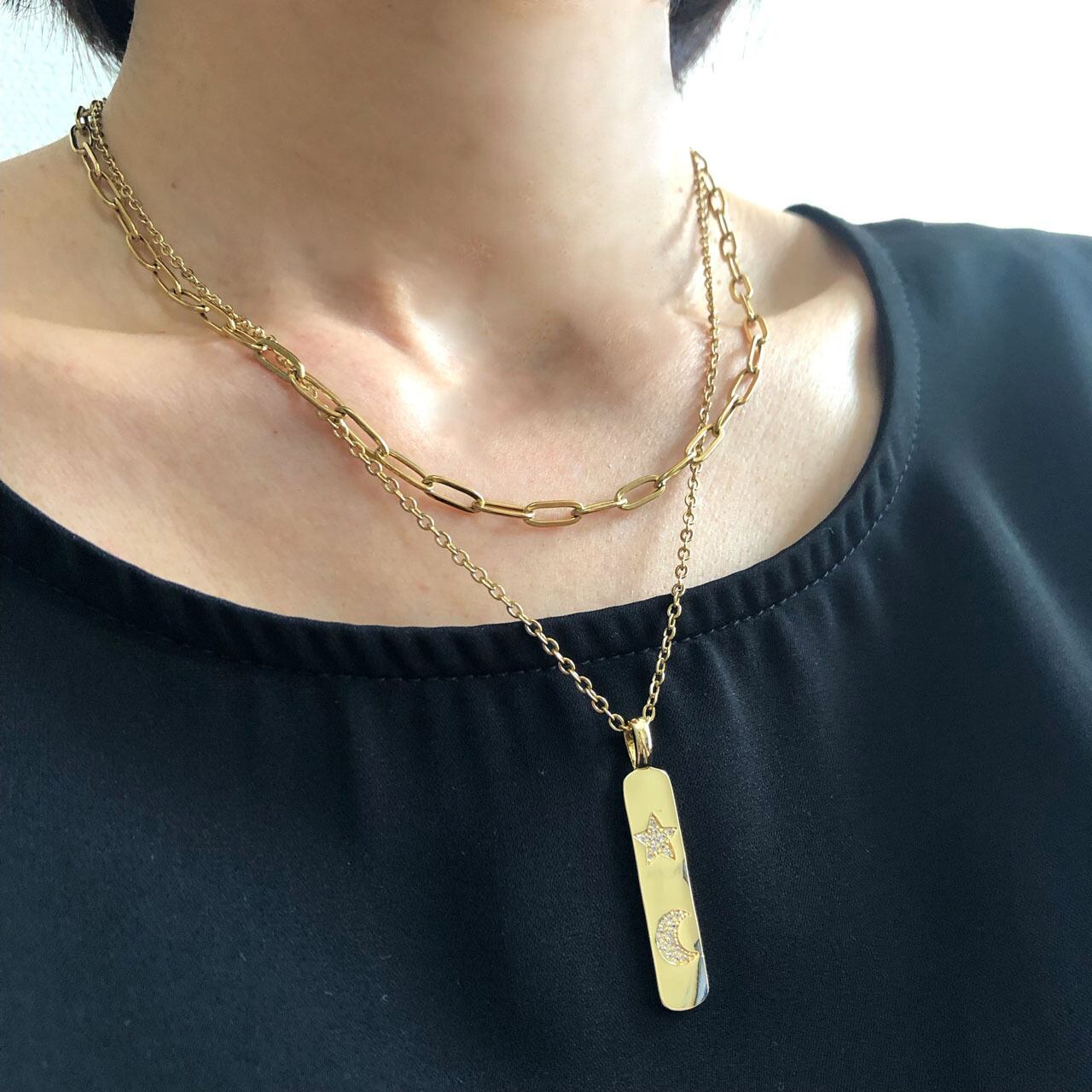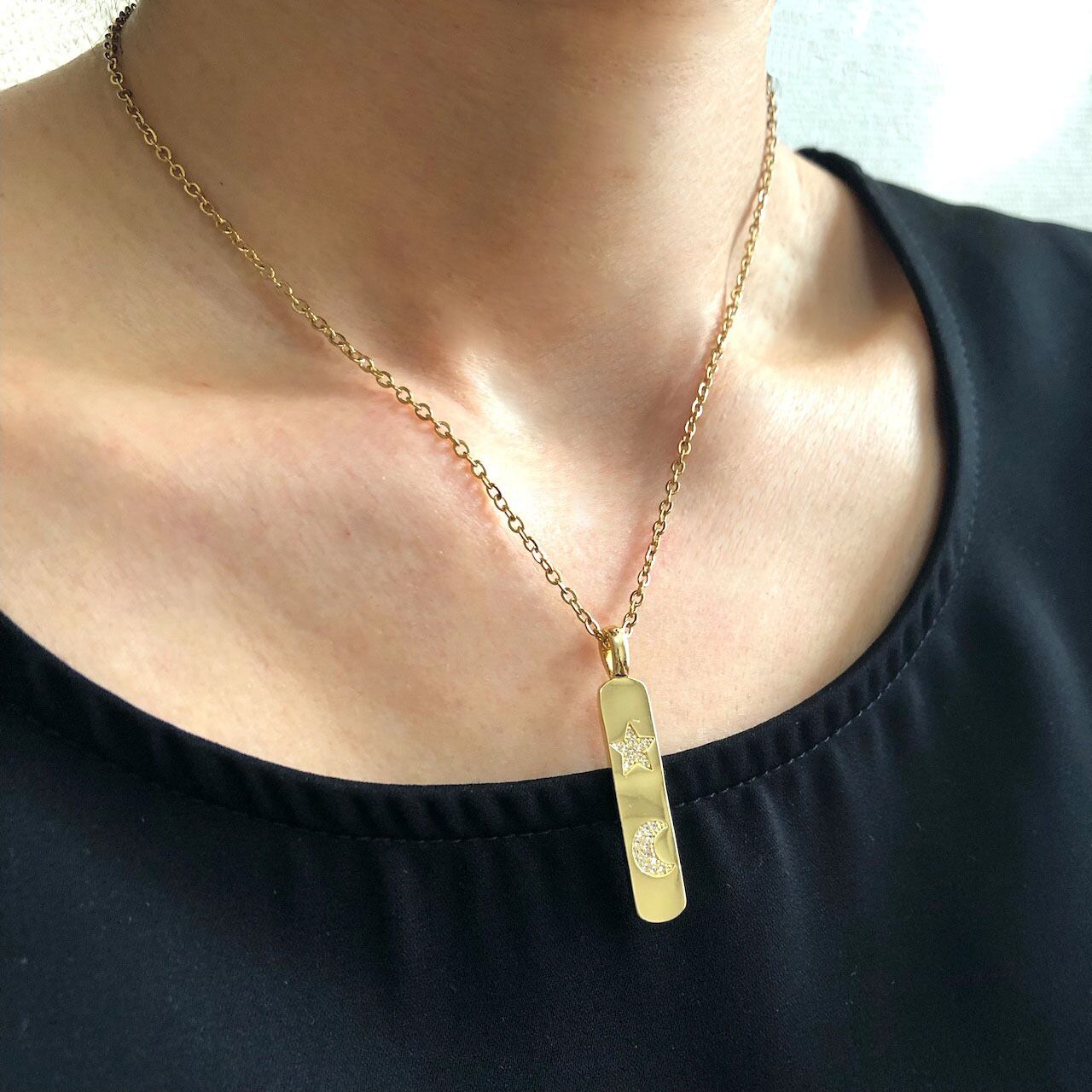 星と月が並んだレクタングルネックレス ステンレスチェーン ゴールド ハンドメイド
