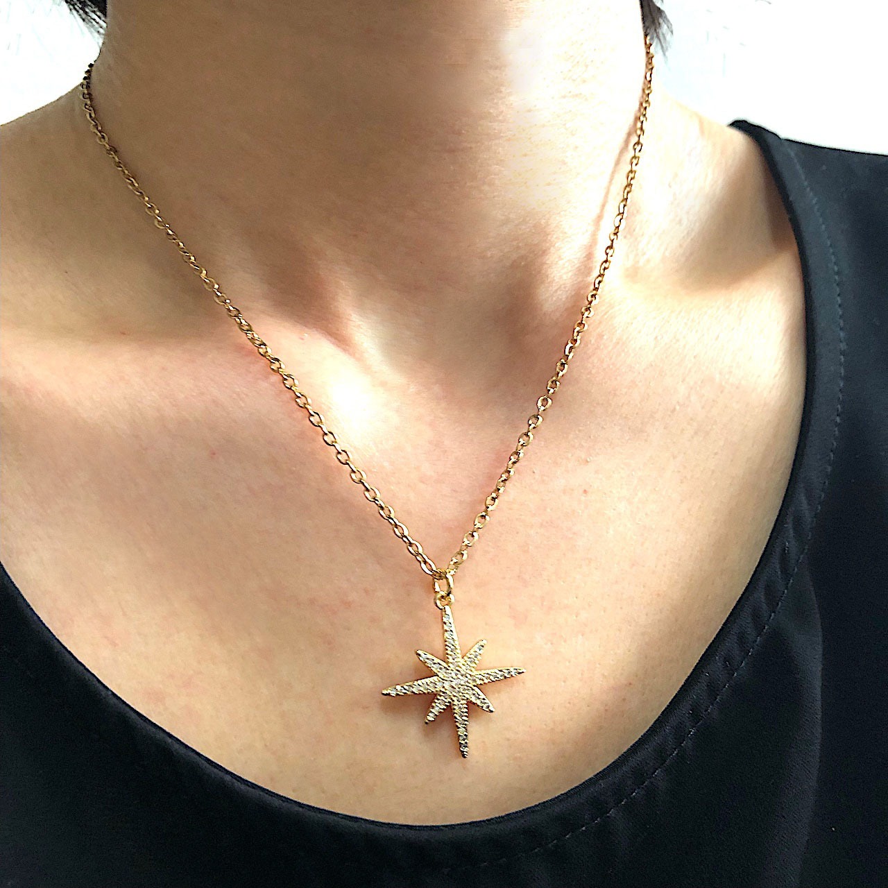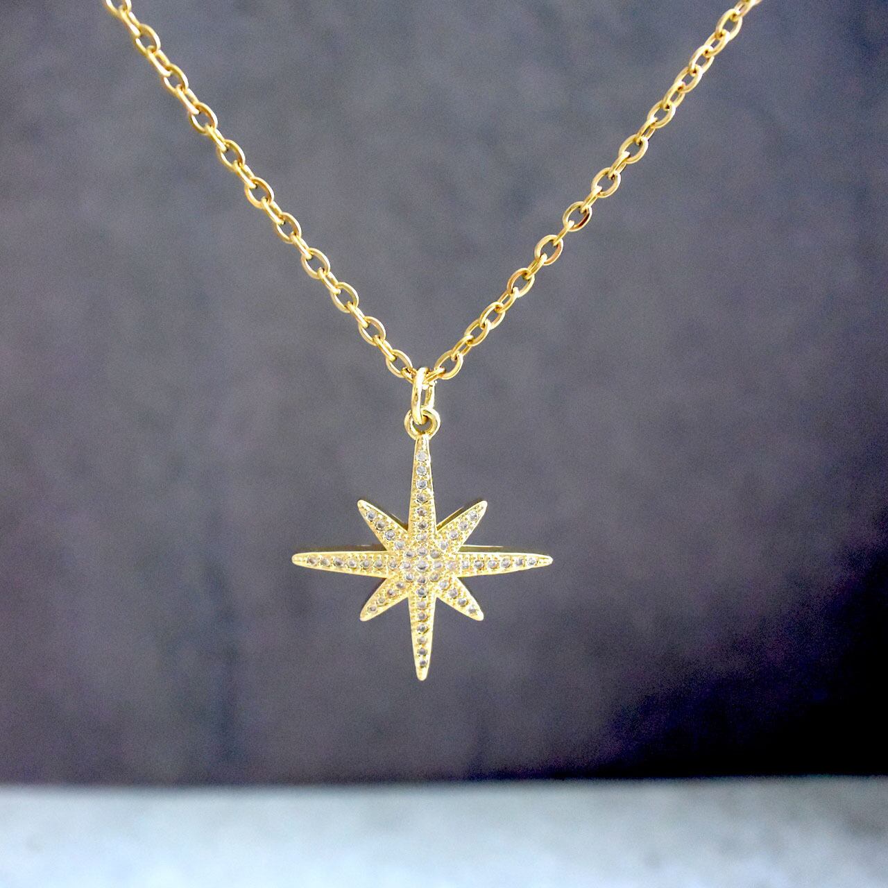 マイクロキュービックジルコニアが散りばめられた、大ぶりの八芒星が、一番星のように煌めく華やかなネックレスです。
