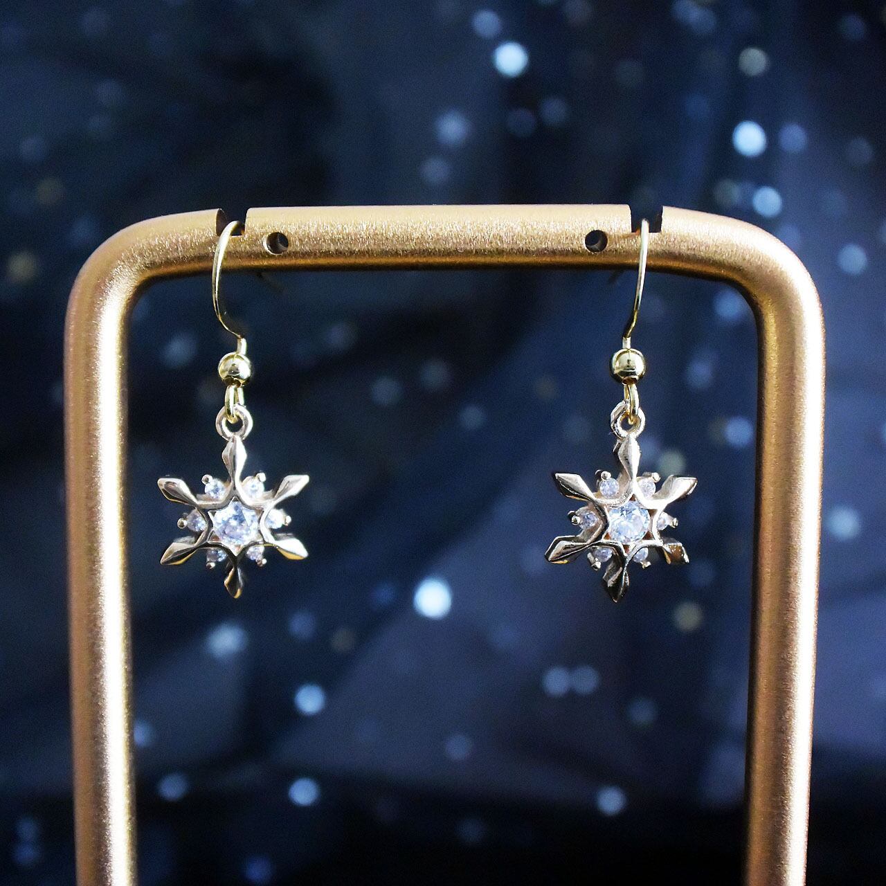ふっくらとしたデザインのストーンが付いた雪の結晶チャームに、キュービックジルコニアがキラリと輝く、上品でシンプルなピアスです。