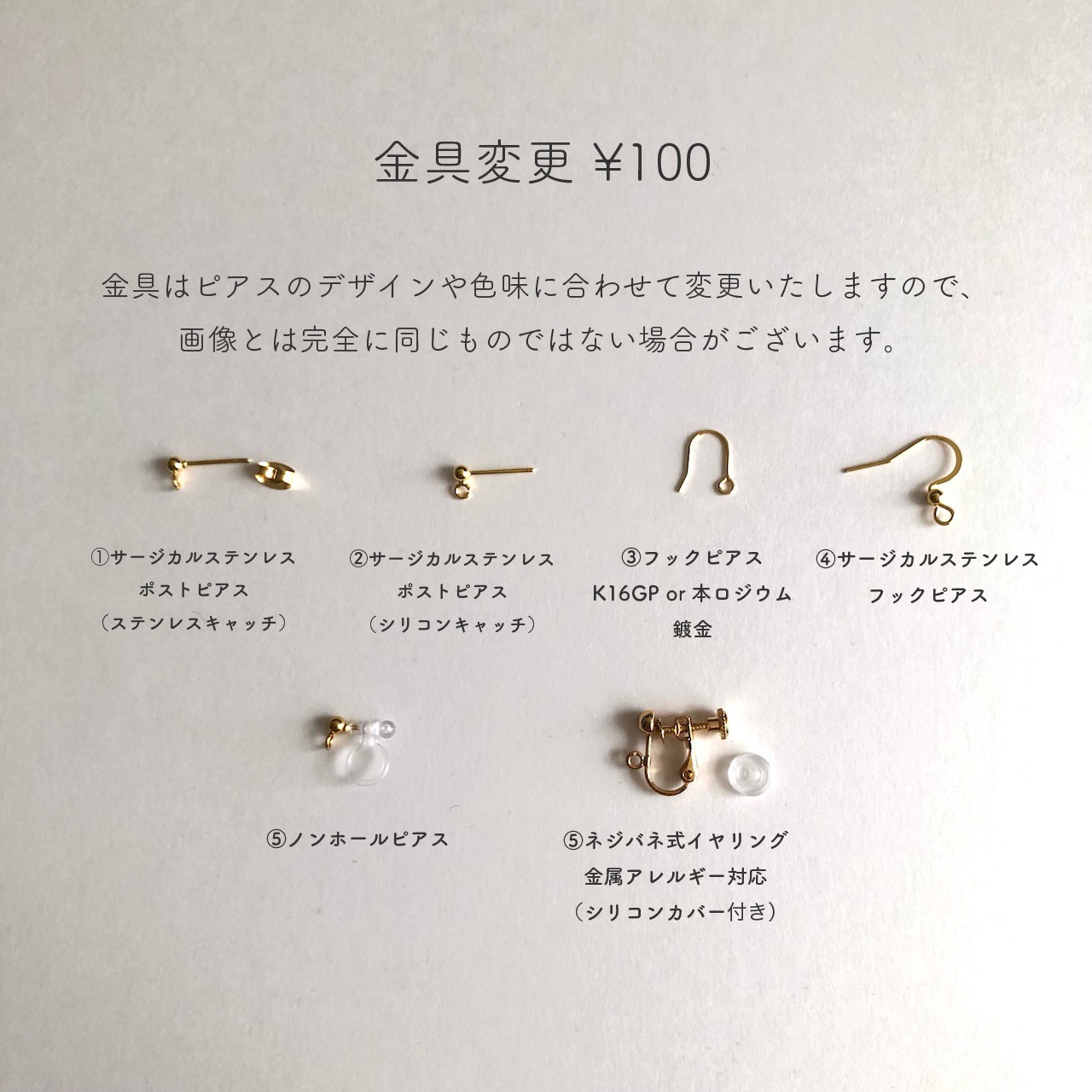 金属アレルギー対応で変更ご希望の方は、元々ニッケルフリー、サージカルステンレスの金具でお作りしているものもございますので、よくご確認の上、ご利用下さい。