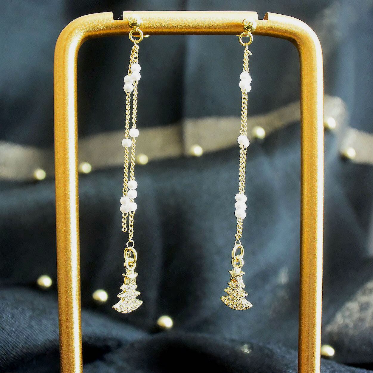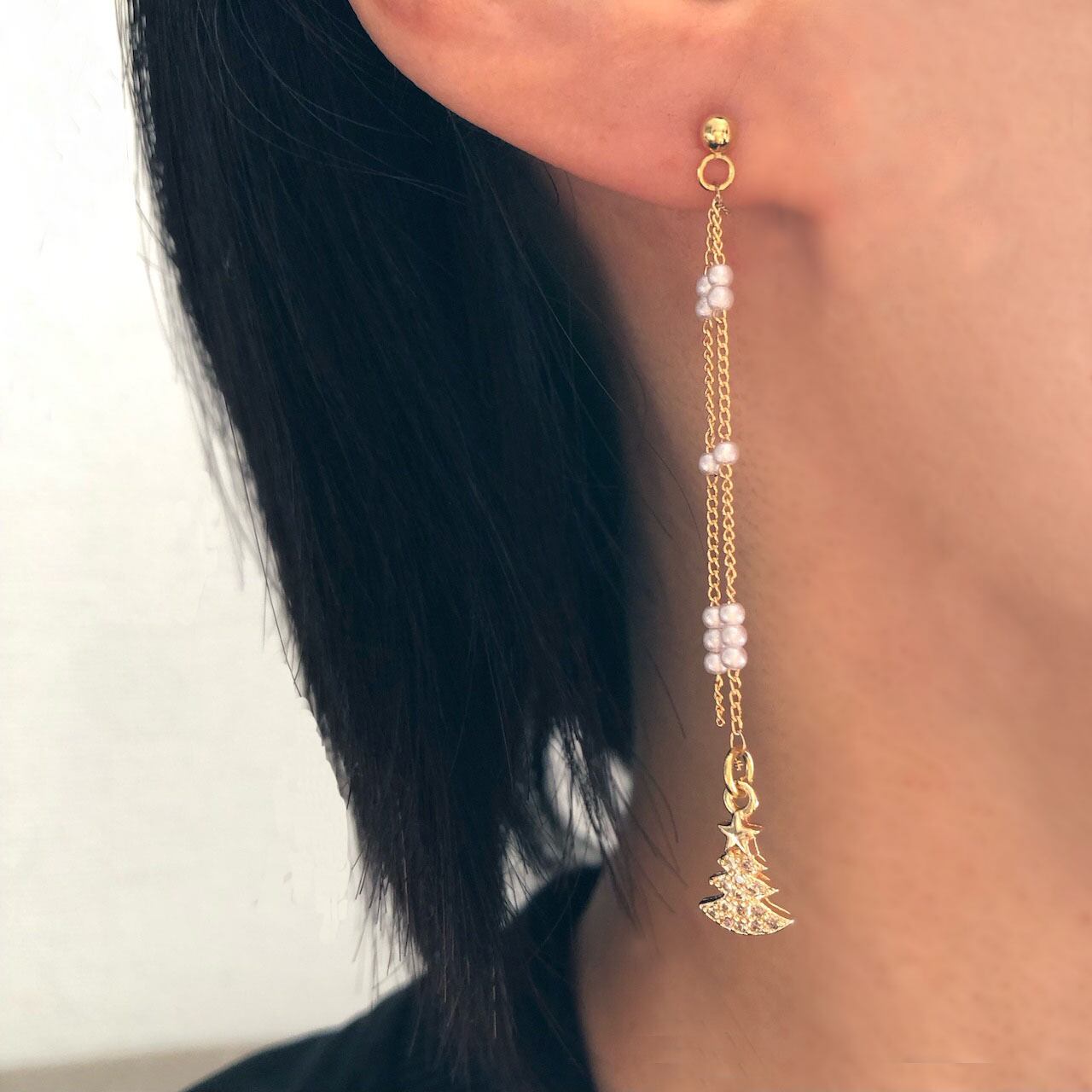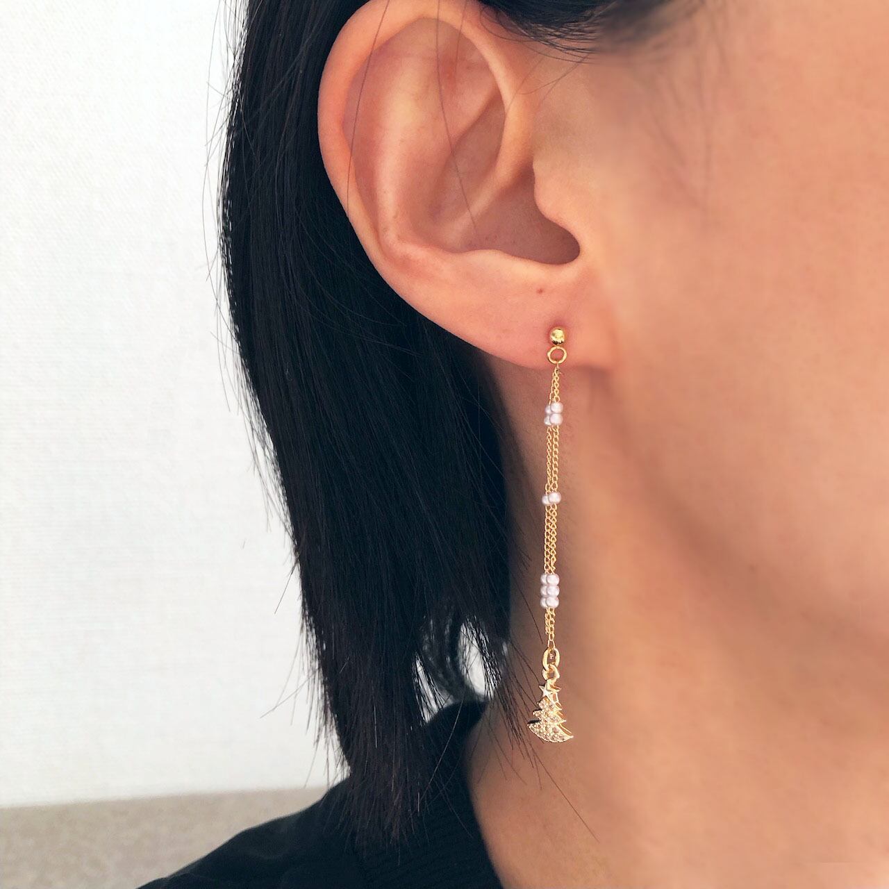 キュービックジルコニアと18KGP本金メッキの、華奢ながら本物の煌めきを放つクリスマスツリーに、降り積もる雪をイメージした、超小粒のパールがついたチェーンを繋いだロングピアスです。