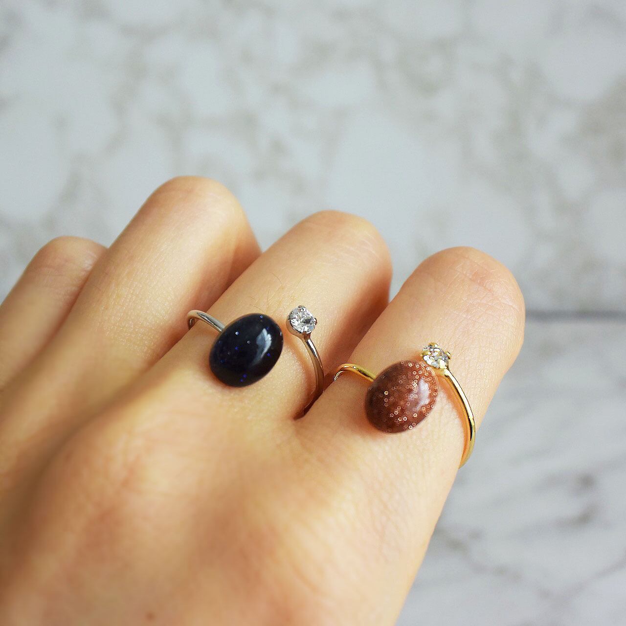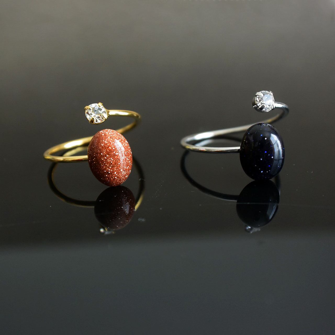 太陽の恵みのようなレッドサンドストーンと、夜空のようなブルーサンドストーンのルースストーン(裸石)に、それぞれラインストーンが向かい側に付いた、シンプルなリングを作りました。