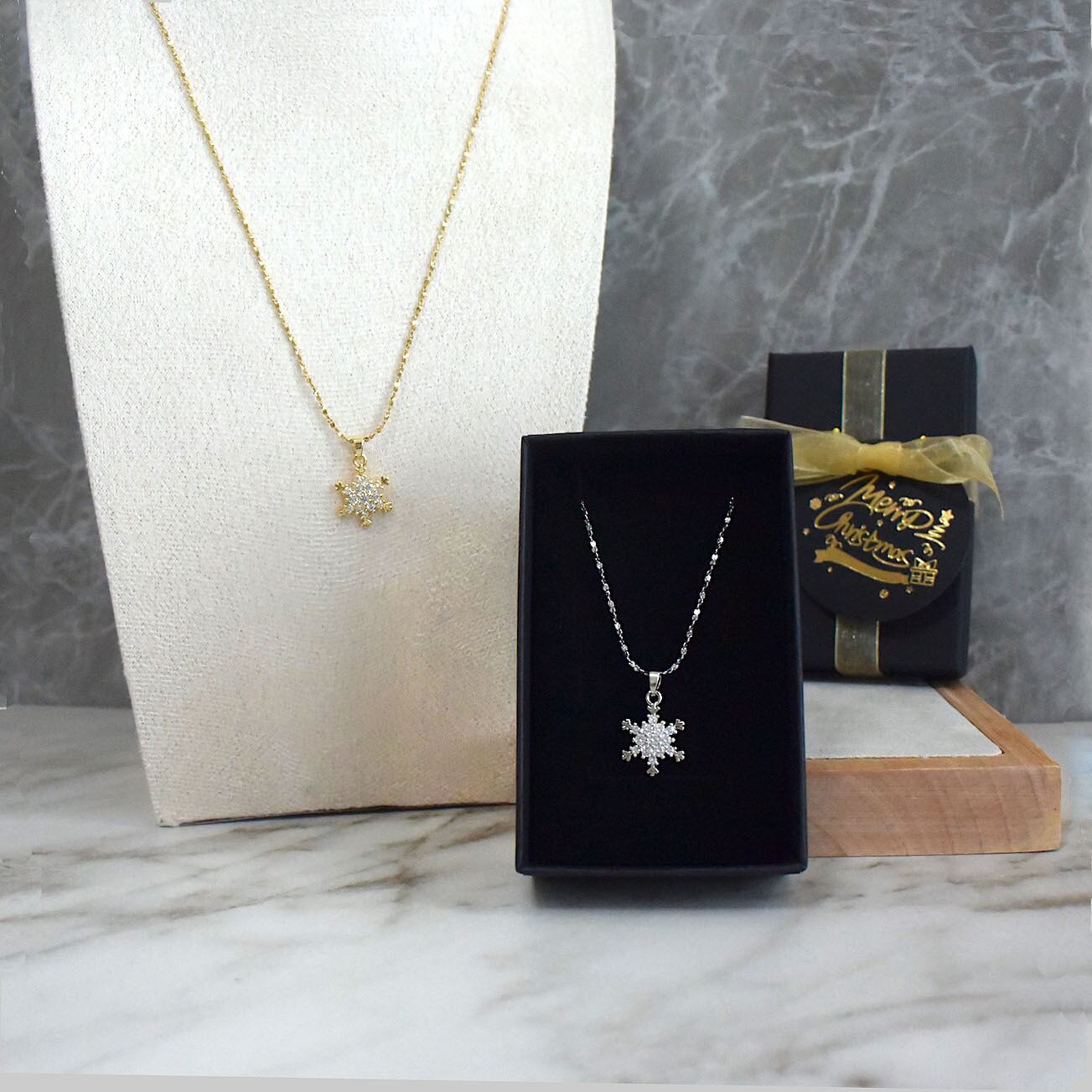 キュービックジルコニアが真ん中に散りばめられた雪の結晶に、キラキラと光を反射するデザインチェーンを組み合わせた、ホリデーシーズンにぴったりな華やかなネックレスです。