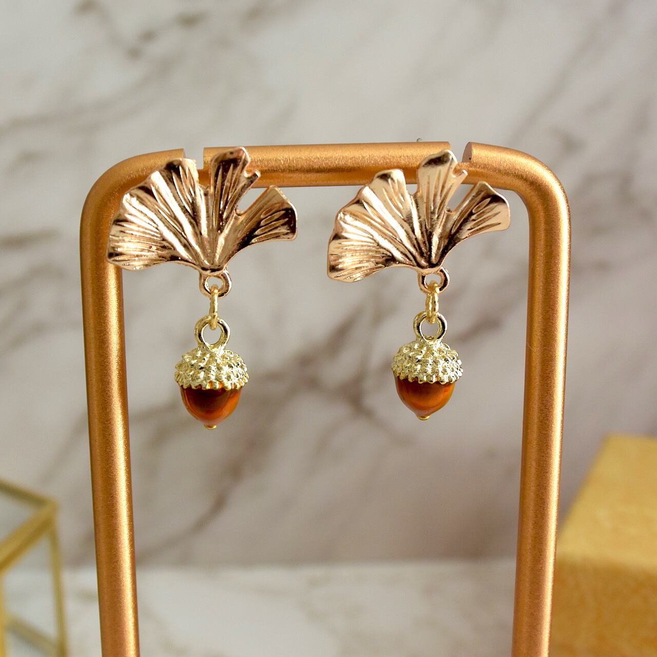 リアルなイチョウの葉と、かわいいサイズのどんぐりを合わせた秋冬ピアス。