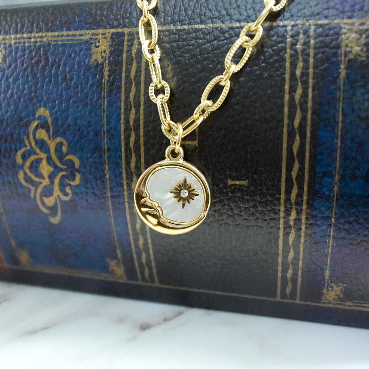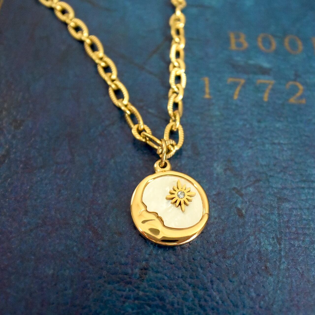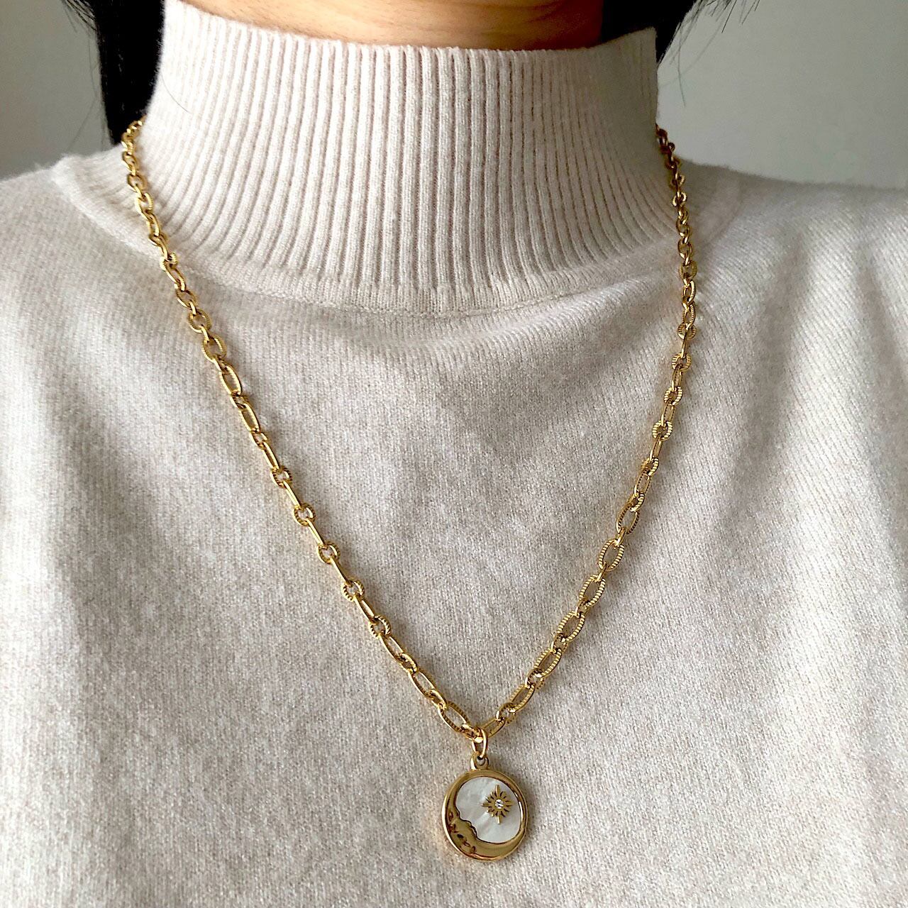 お月さまのシェルペンダント チャンキーチェーンネックレス ステンレスチェーン ゴールド