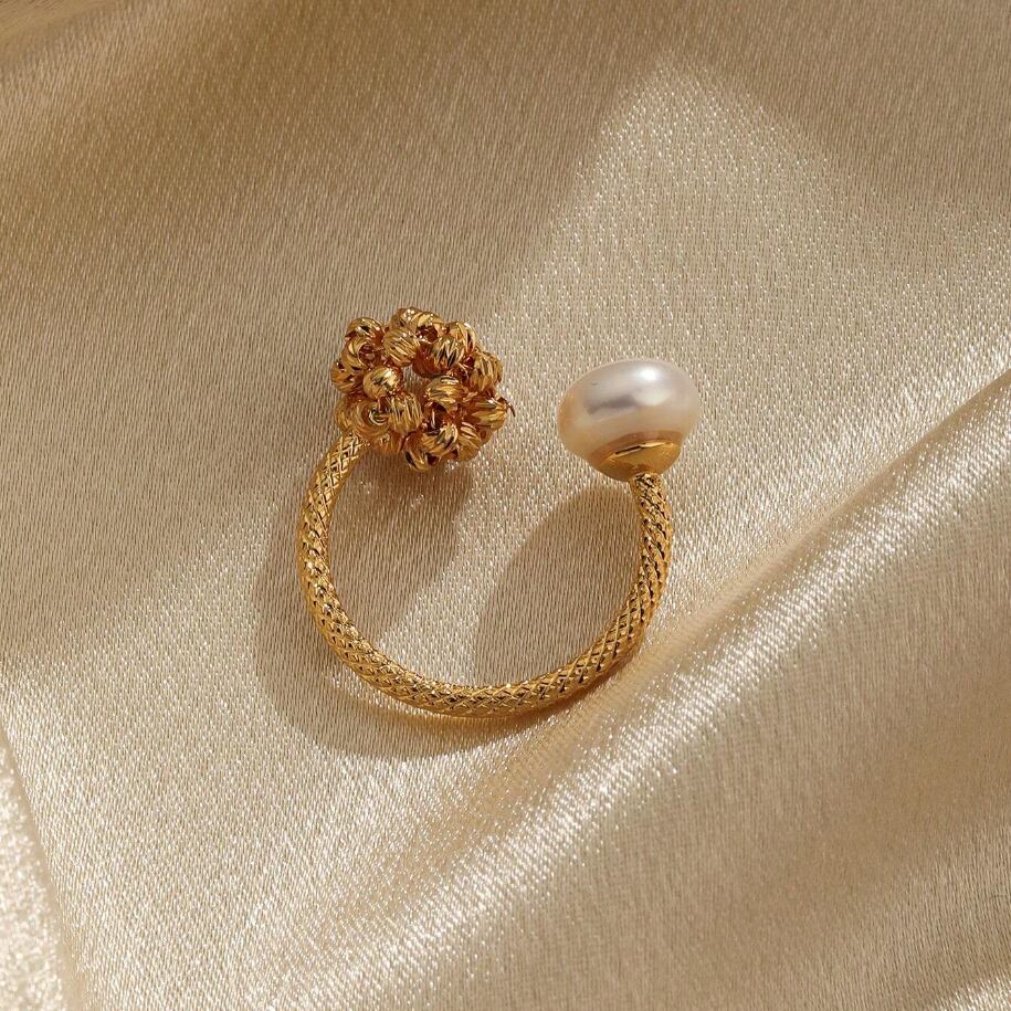 淡水パールとビーズフラワーのボリュームフォークリング ゴールド