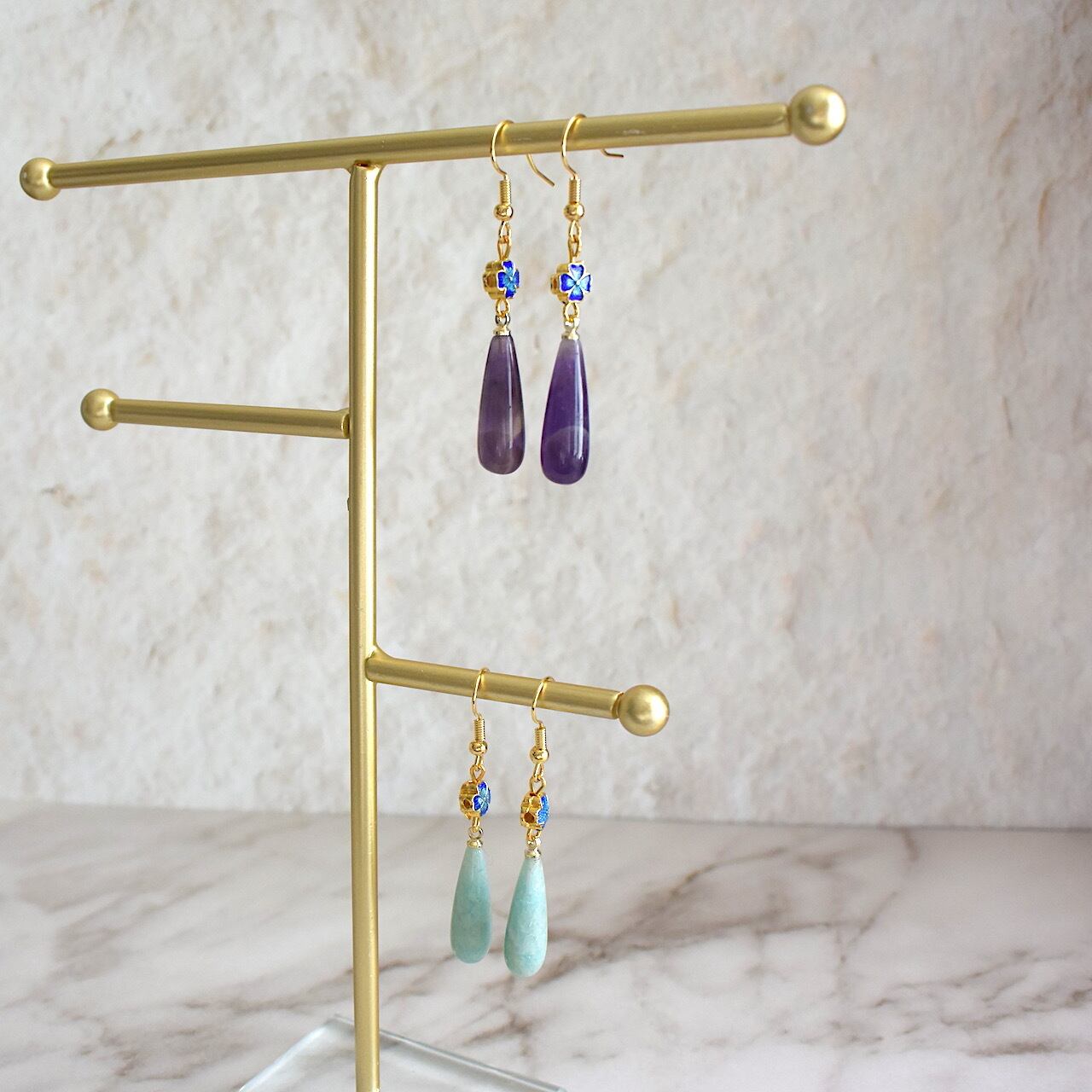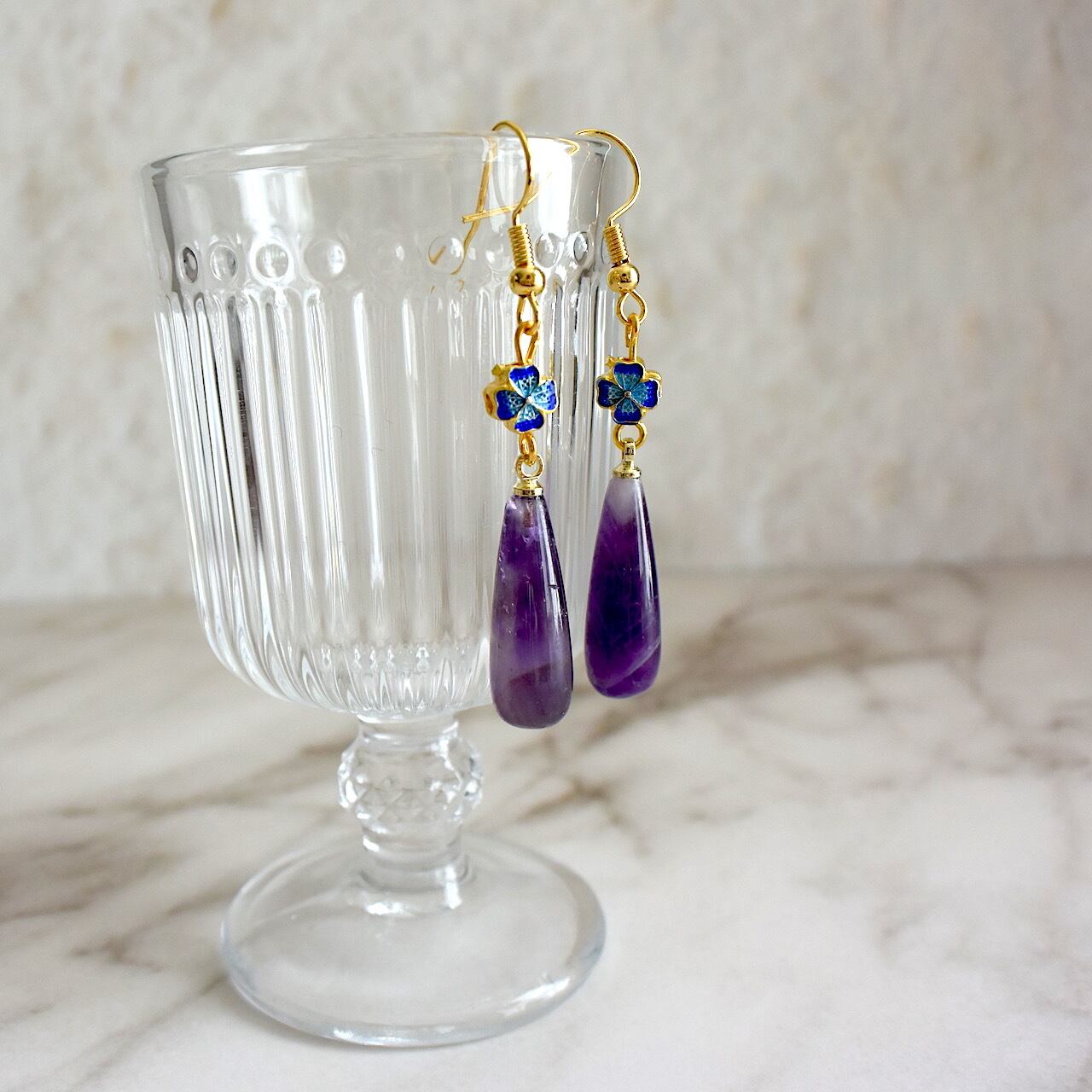 中華風の青いかわいらしいお花と、細長いティアドロップ型の天然石アメジストを合わせた、エキゾチックで華やかなピアスです。