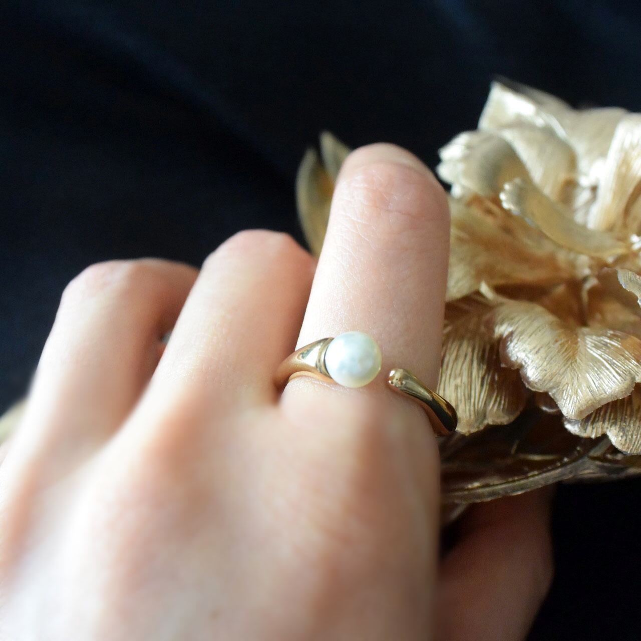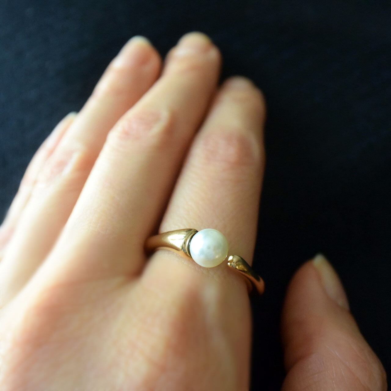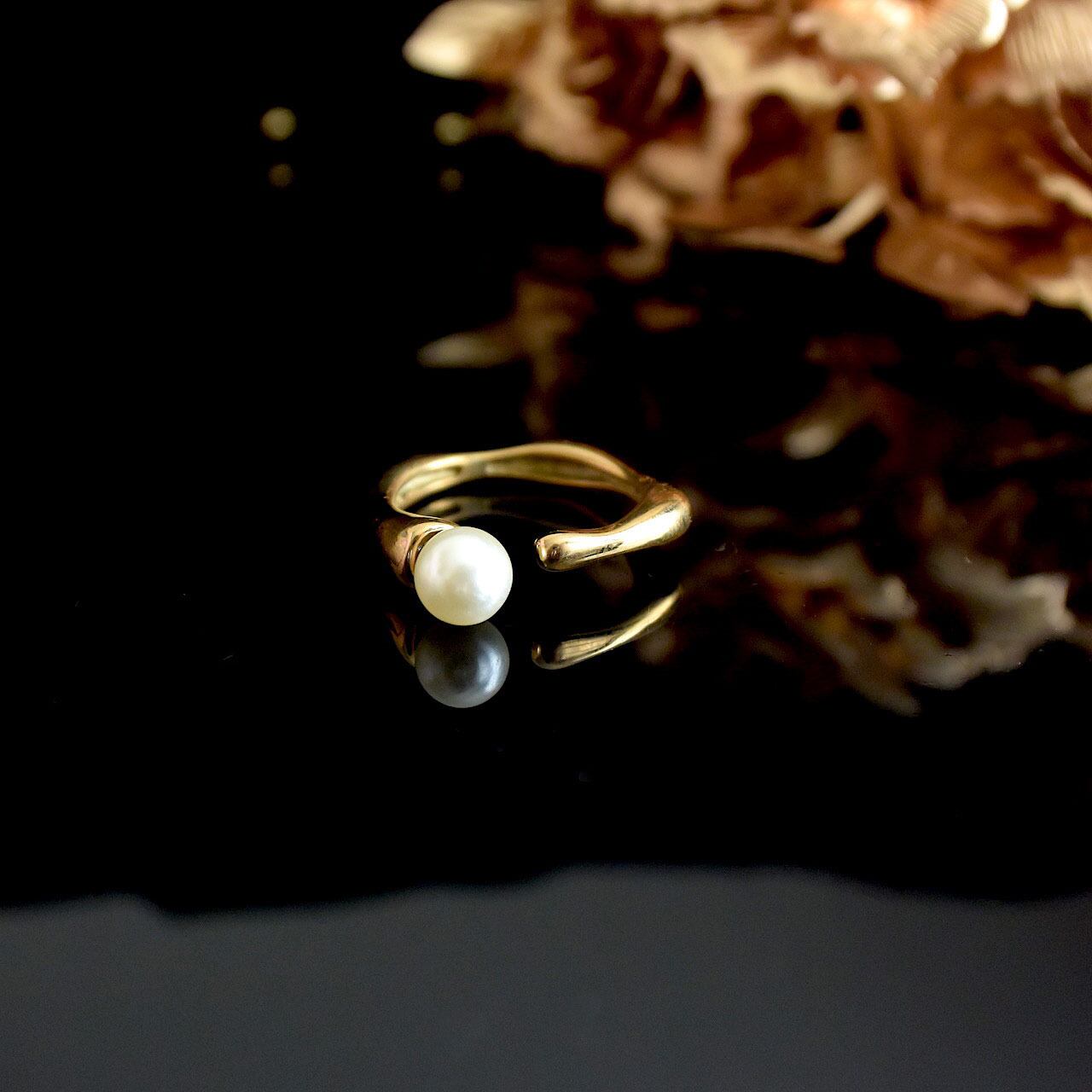 歪なスクエア型のリングに、控えめなサイズのパールを合わせた端正なフォークリングです。