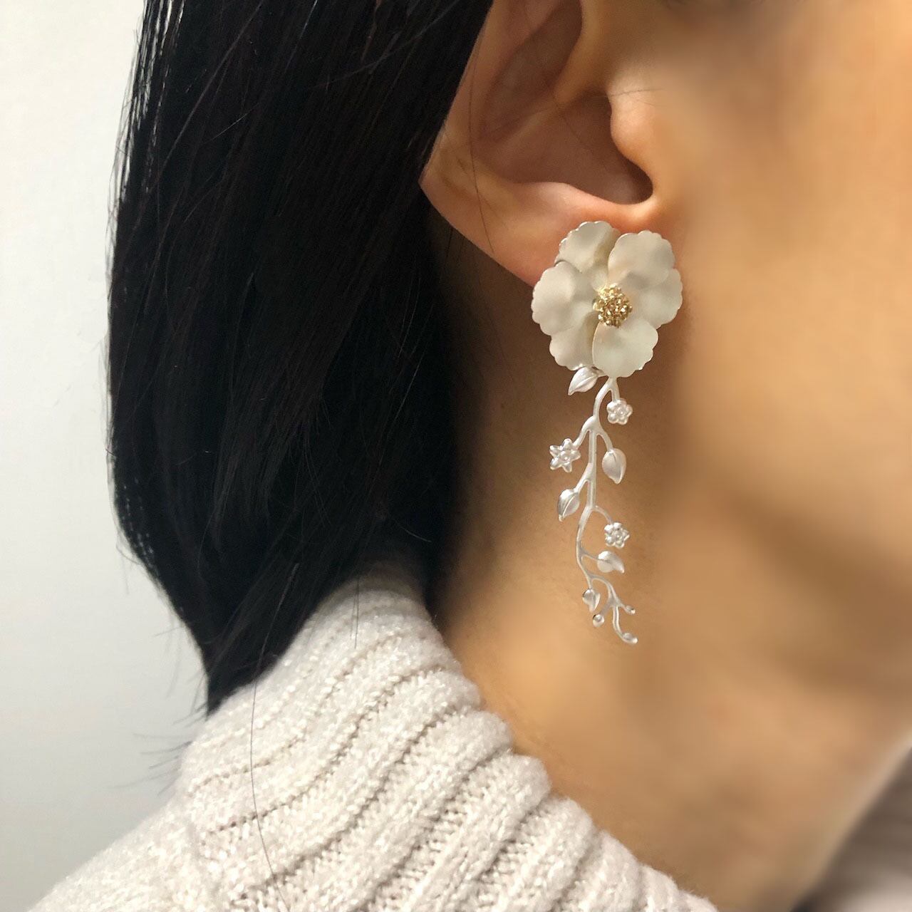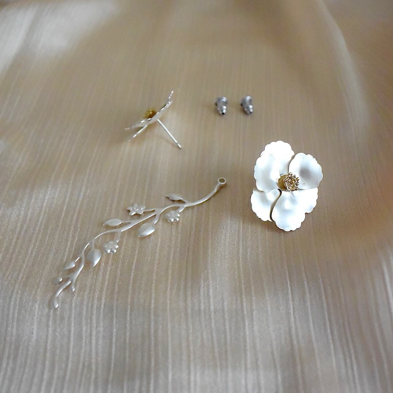 カメリアの2wayアシンメトリーピアス ホワイトシルバー