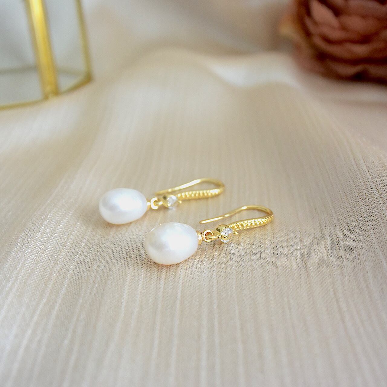 上品な淡水パールに、ジルコニアの装飾を施したフック型金具を合わせた、シンプルなピアスです。