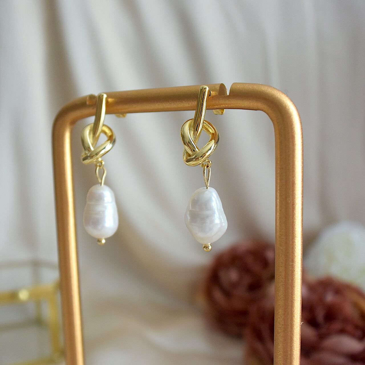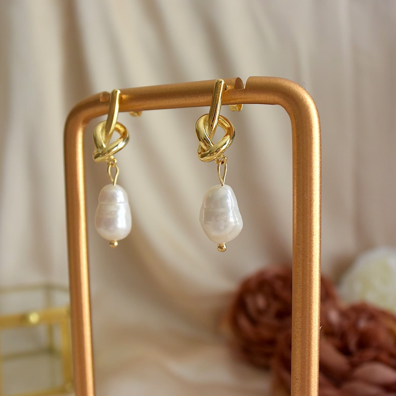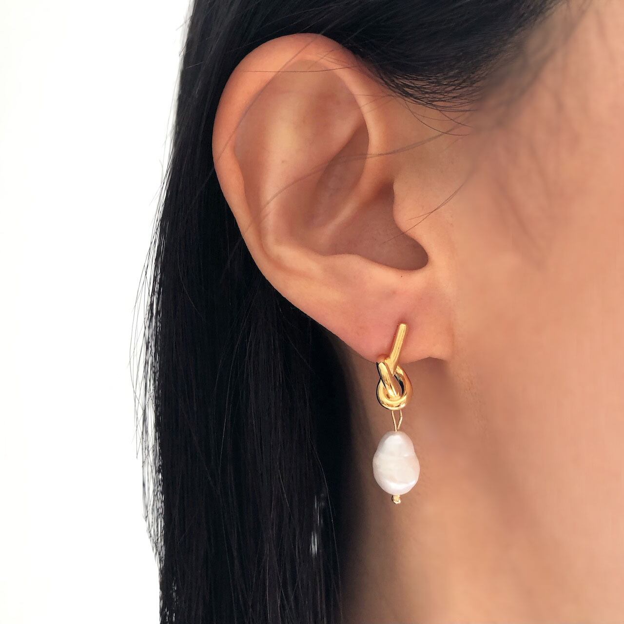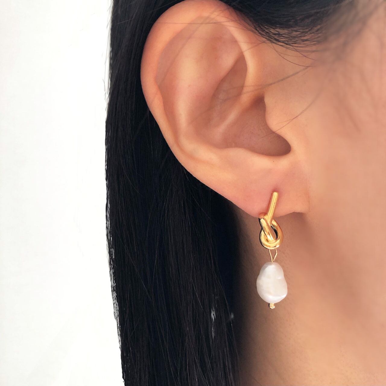 ノット(結び目)のデザインの金具に、歪な大粒のバロックパールを合わせたモード感のあるピアスです。