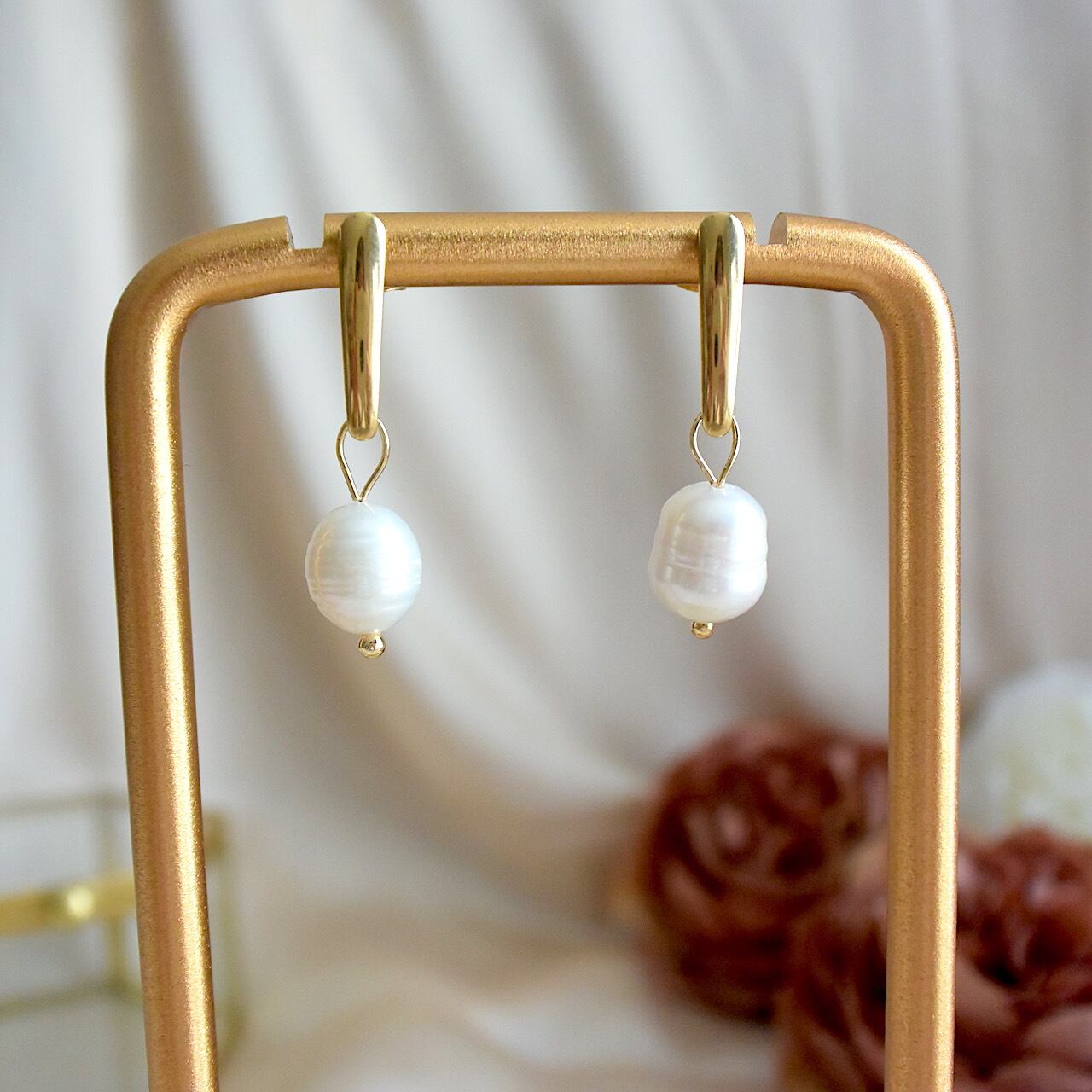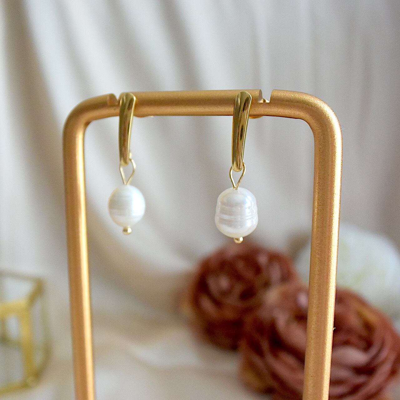 シンプルで落ち着いた色味の金具に、歪な大粒のバロックパールを合わせたモード感のあるピアスです。