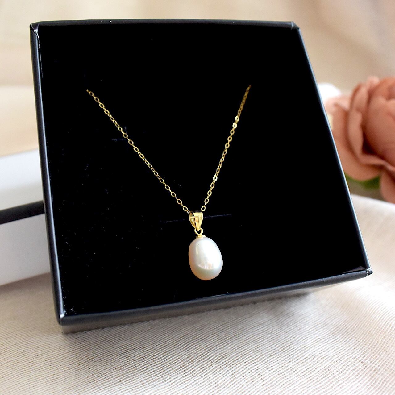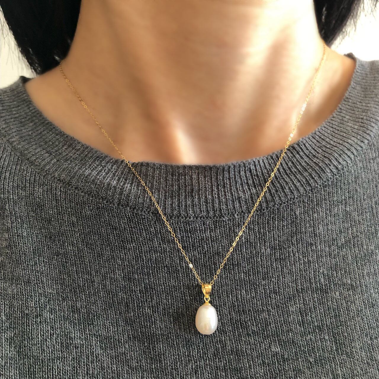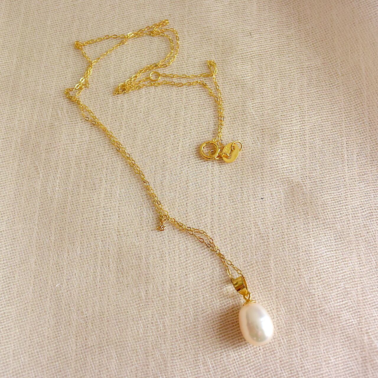 8~9mm玉のしずく型の天然パールに、華奢なゴールドチェーンを組み合わせた、シンプルで上品な雰囲気のネックレスです。
