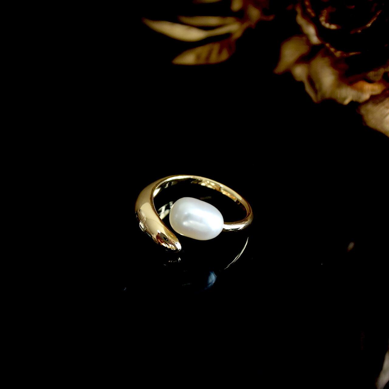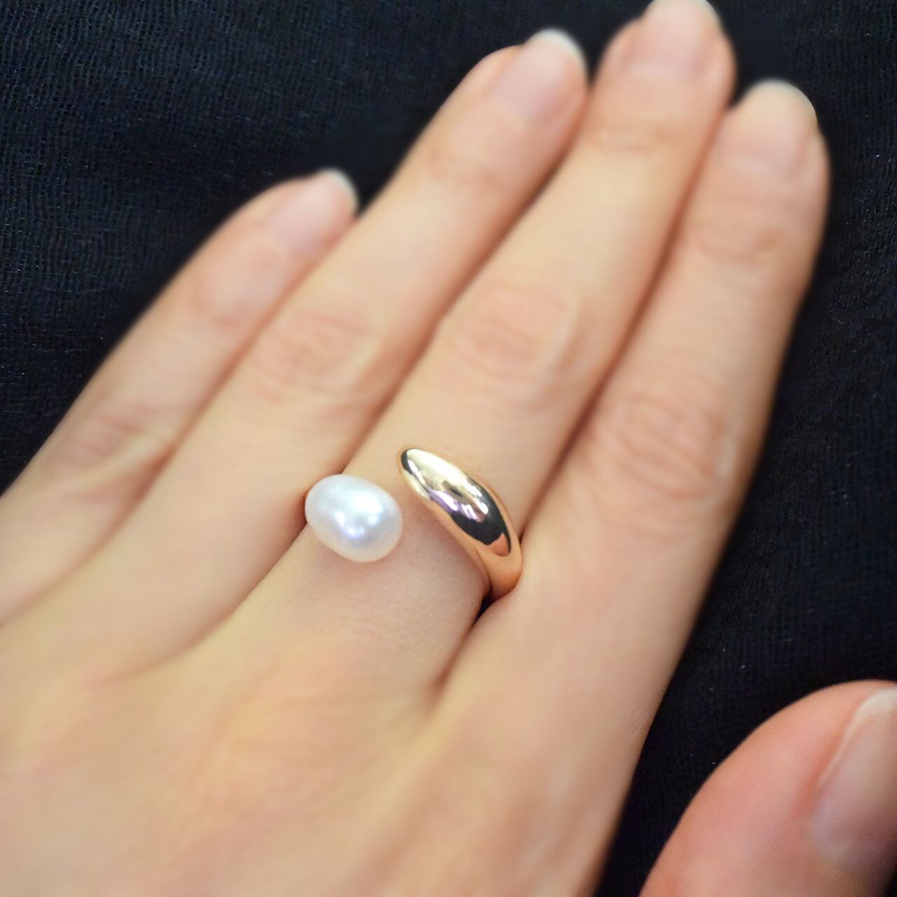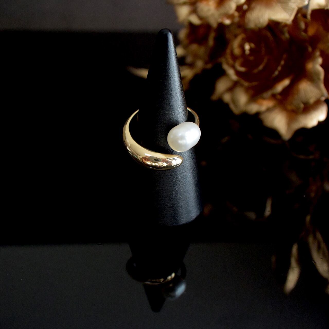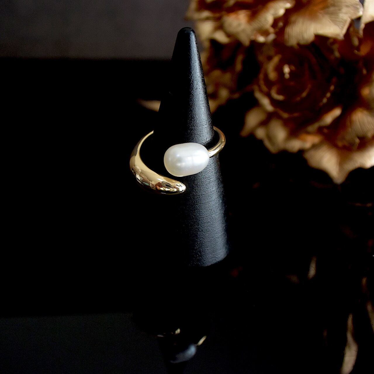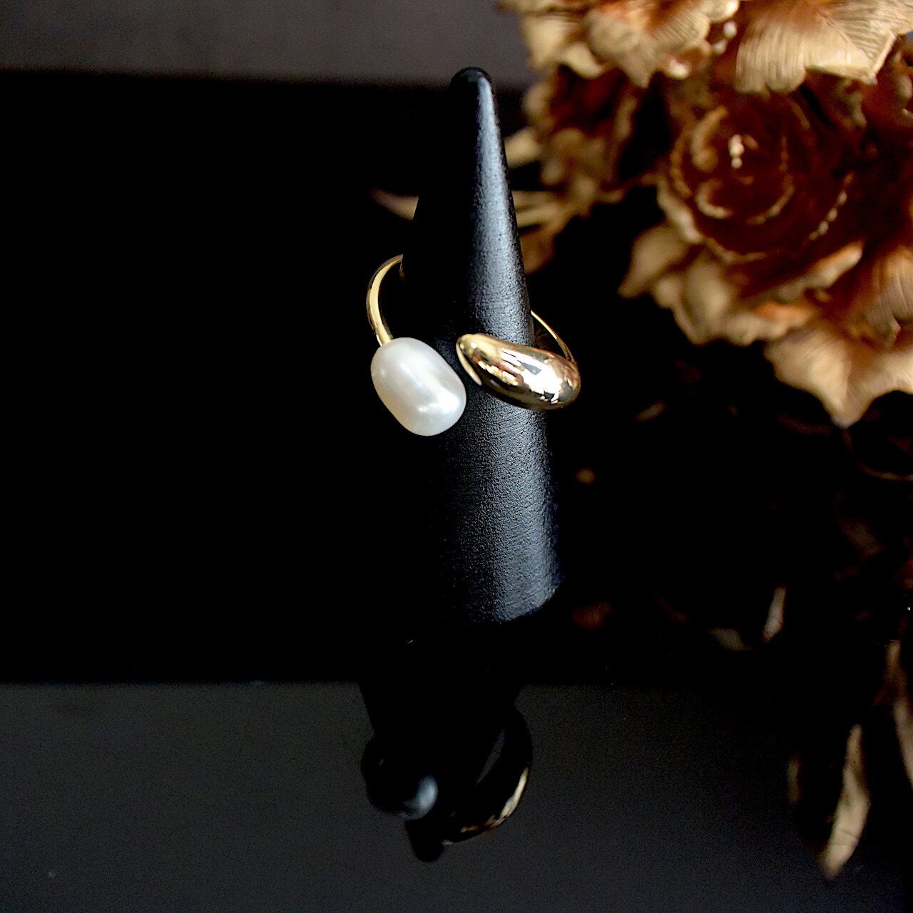 大きめの淡水パールがと太めの金具がクロスして、ほどよいボリュームと品のあるフォークリングです。