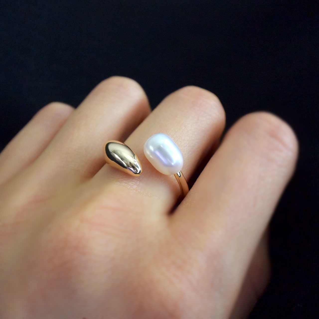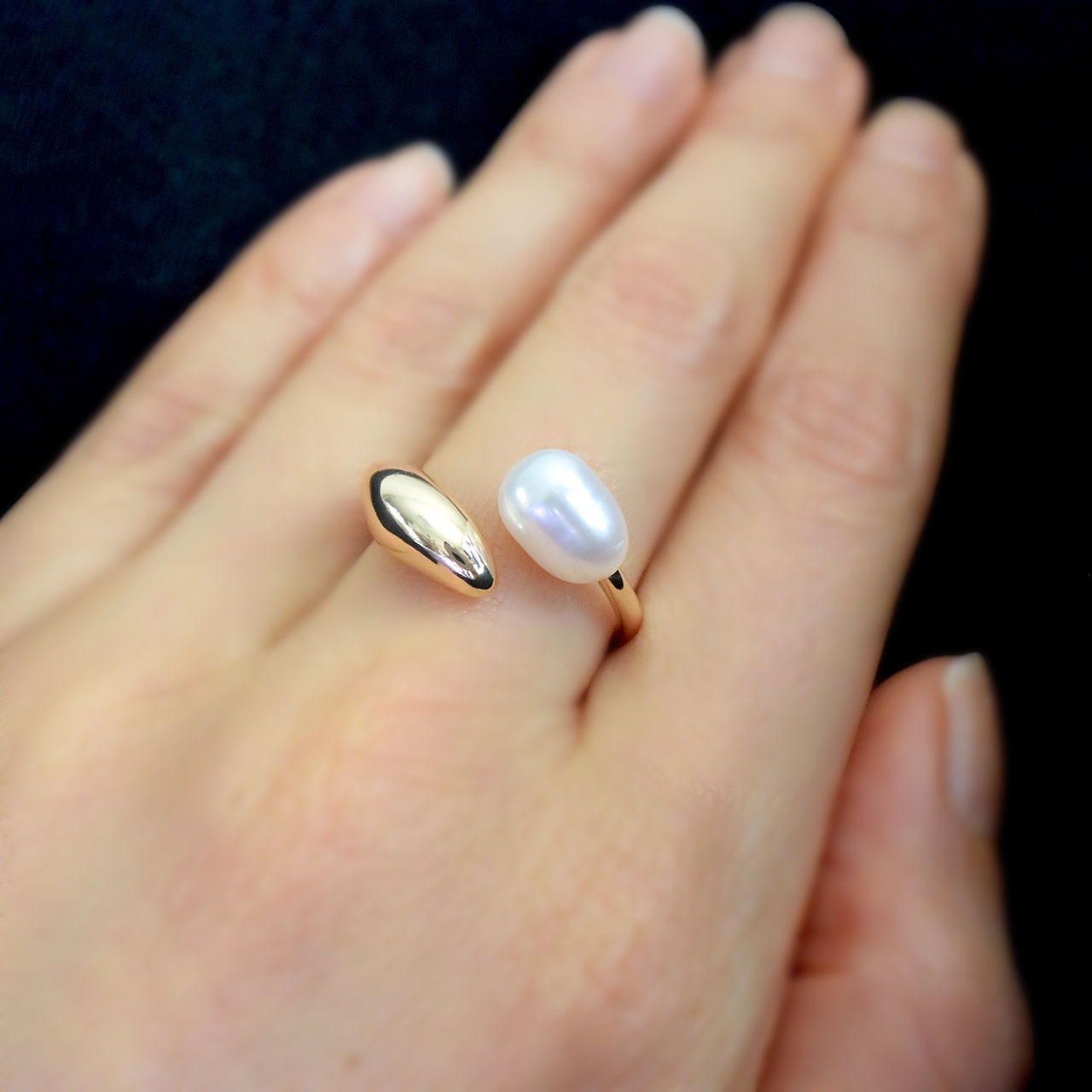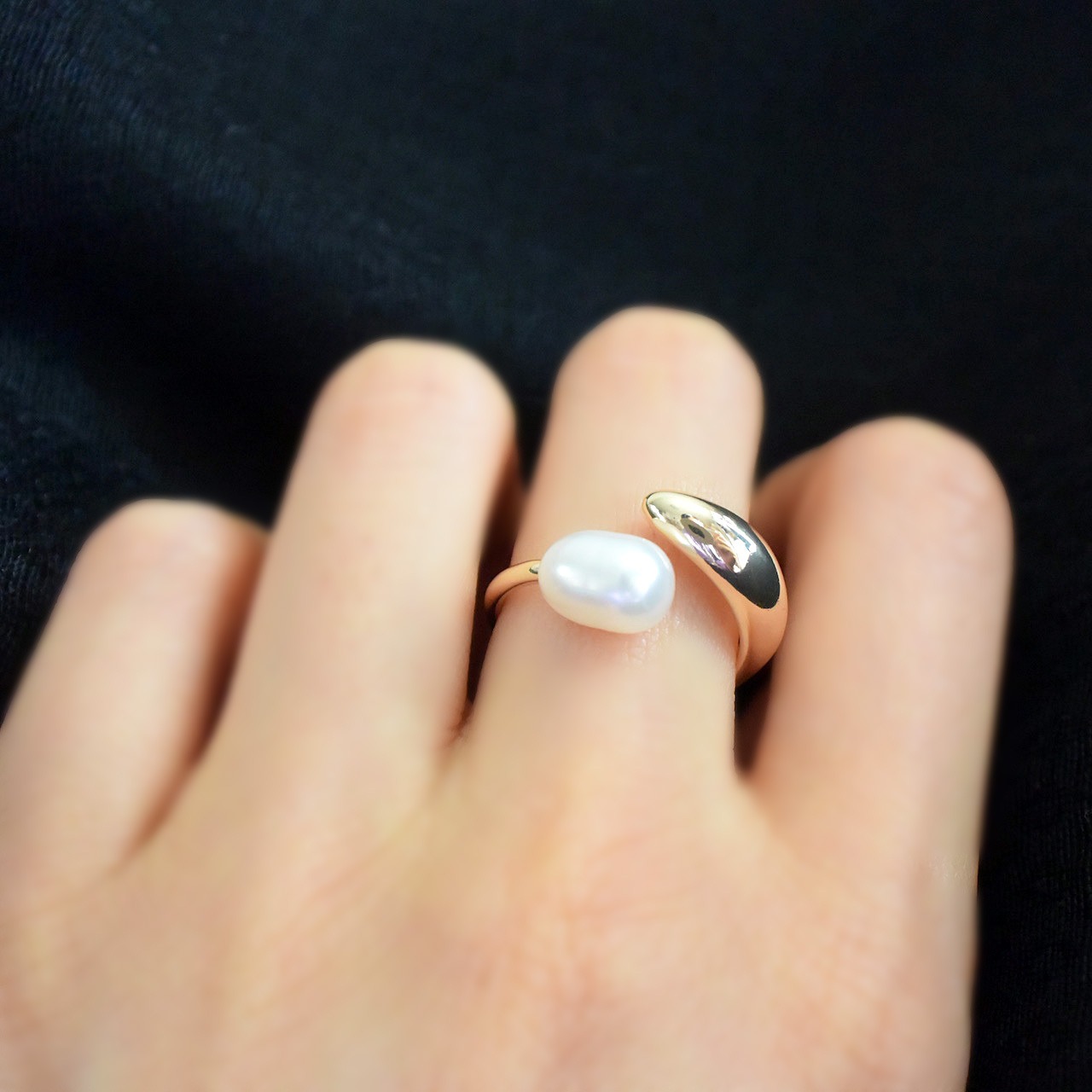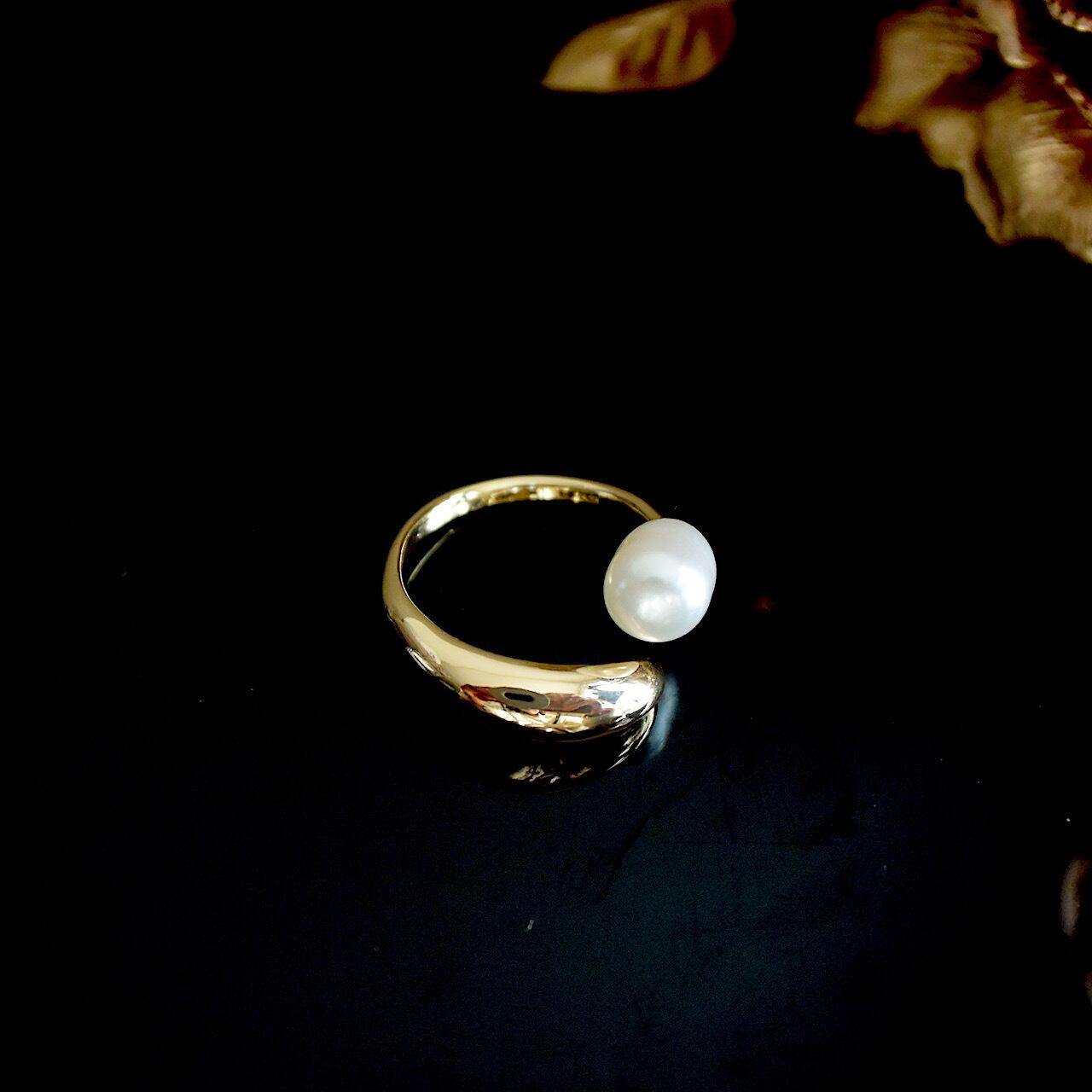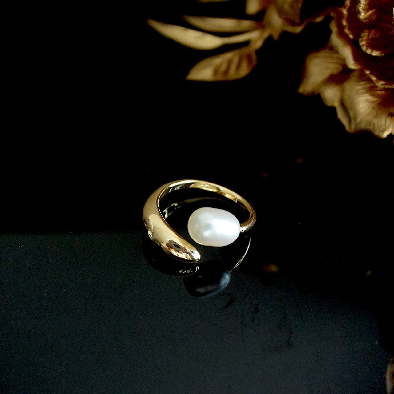 大きめの淡水パールがと太めの金具がクロスして、ほどよいボリュームと品のあるフォークリングです。