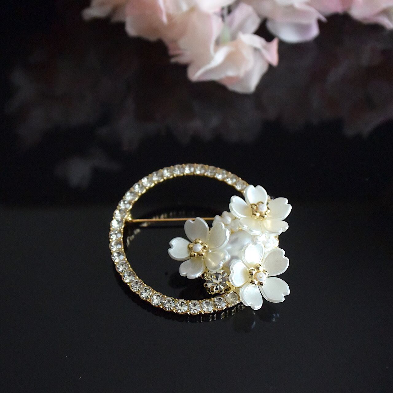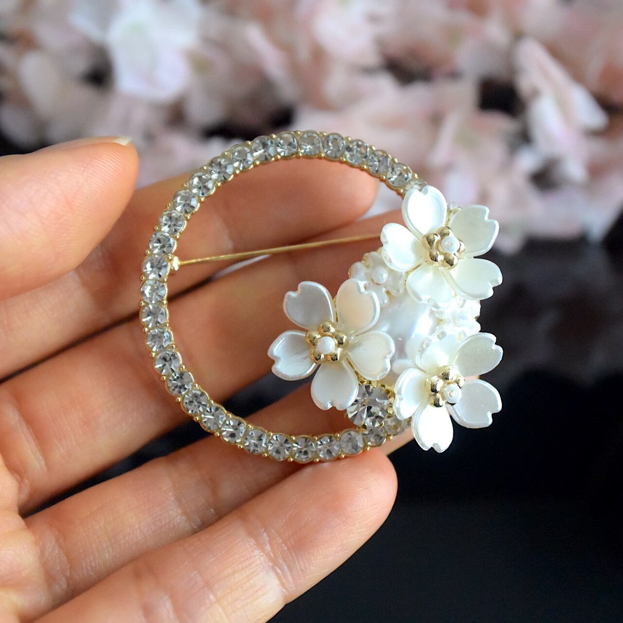 ラインストーンのサークルブローチに、パールをベースとした装飾を施した、3種類の上品な雰囲気のブローチです。