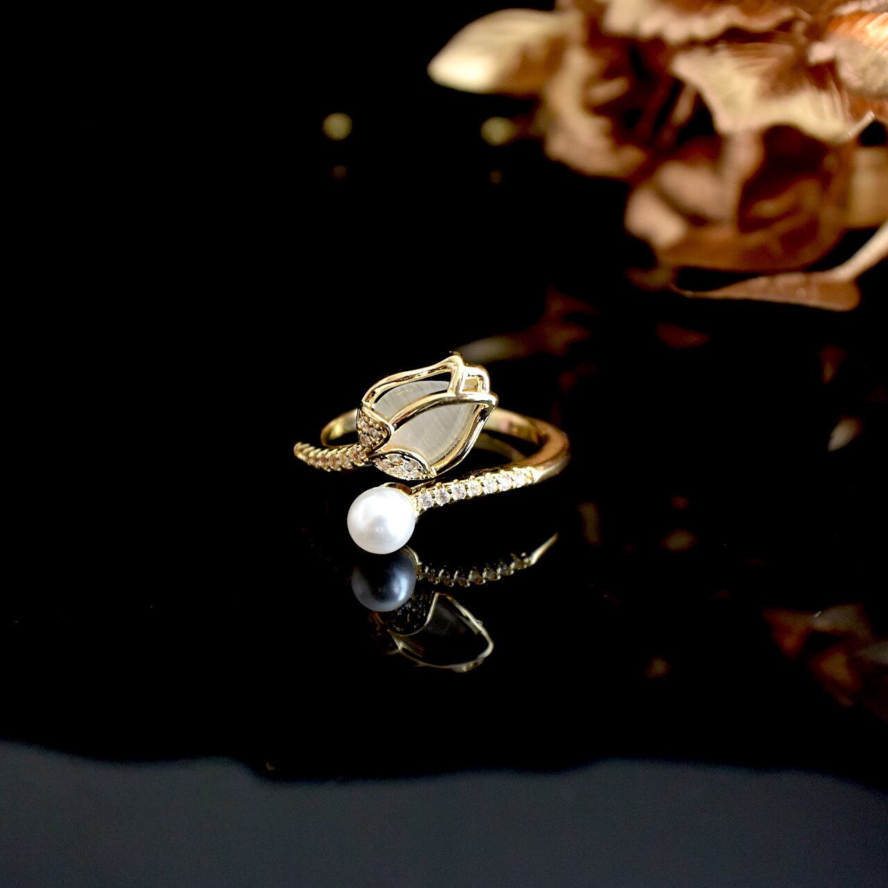 可憐なチューリップとパールが向かい合った、春らしさ満点のリングです。