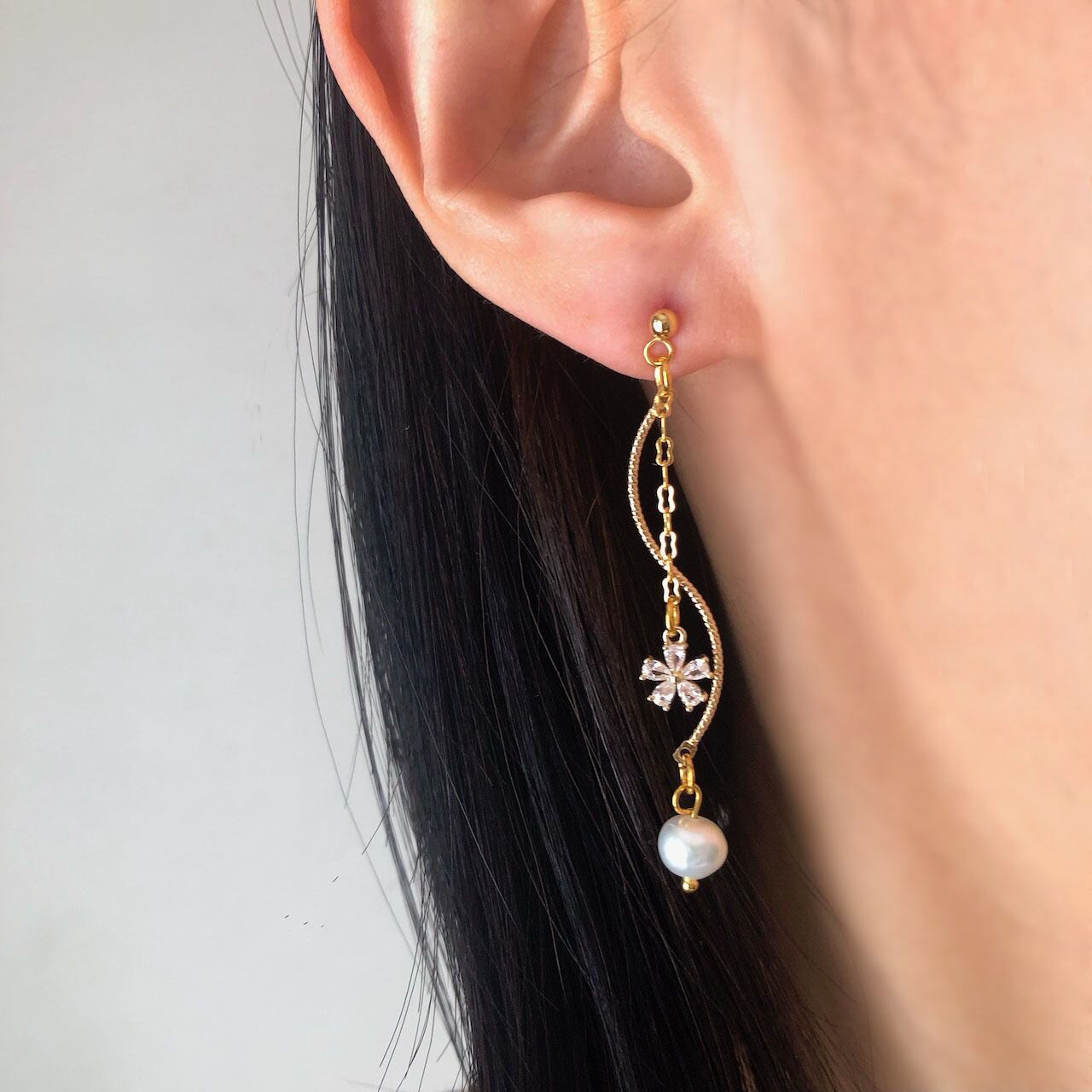 桜のような形の小さなジルコニアチャームを付けたチェーンと、曲線を描いたチャームに淡水パールをあしらった、ゆらゆらと揺れる優美なピアスです。
