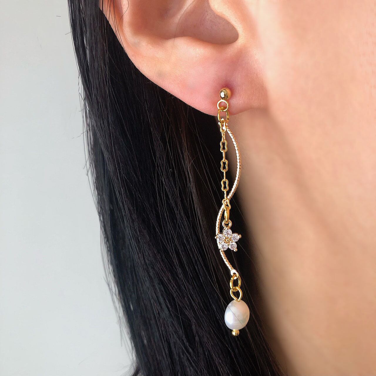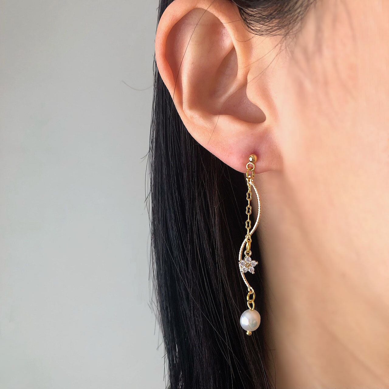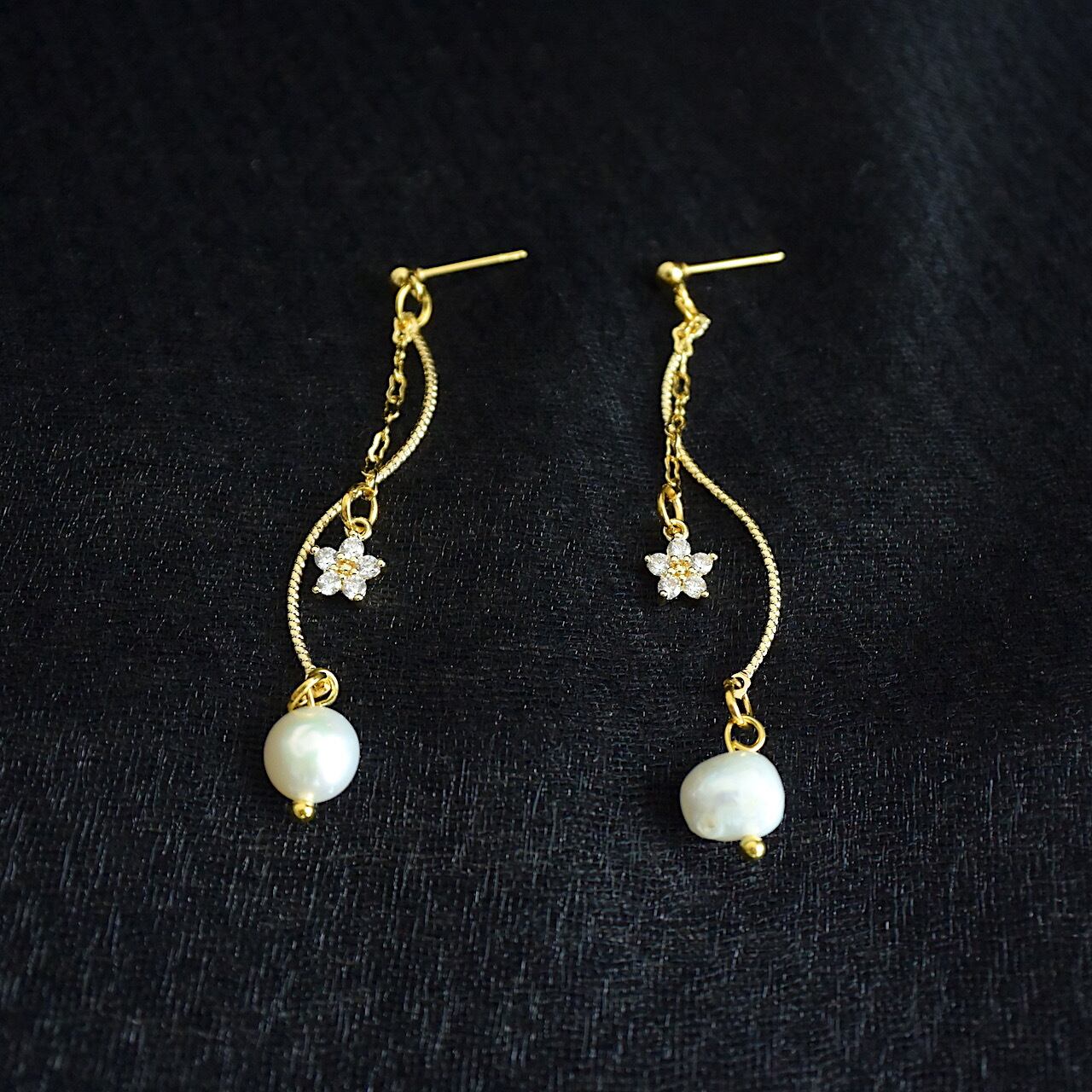 ミニサイズの桜のような形の小さなジルコニアチャームを付けたチェーンと、曲線を描いたチャームに淡水パールをあしらった、ゆらゆらと揺れる優美なピアスです。